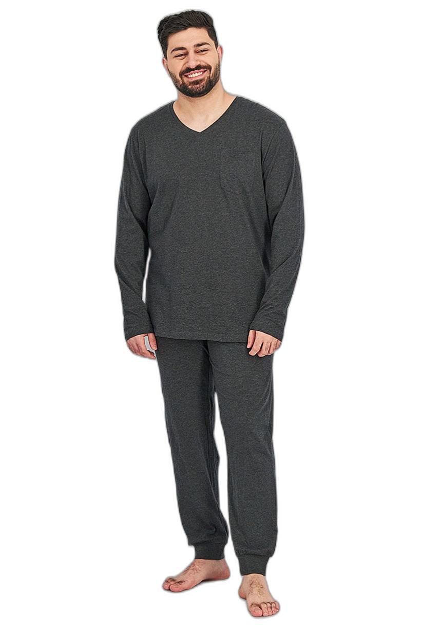 This product is suitable for men and can be easily washed in a machine. It is a set of sleepwear made from 100% cotton fabric in a grey color. The long-sleeved top has a V-neckline and a straight hem, while the bottoms have a pull-on closure. The heather pattern adds a stylish touch to the overall design. The top features long sleeves with a pullover closure.