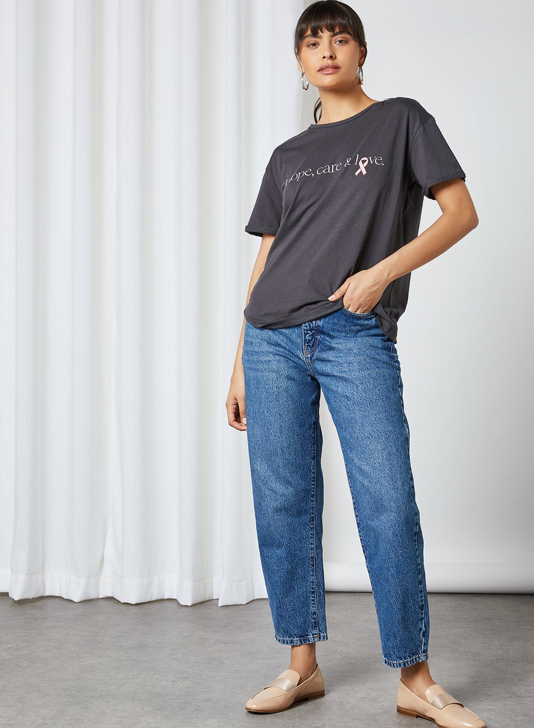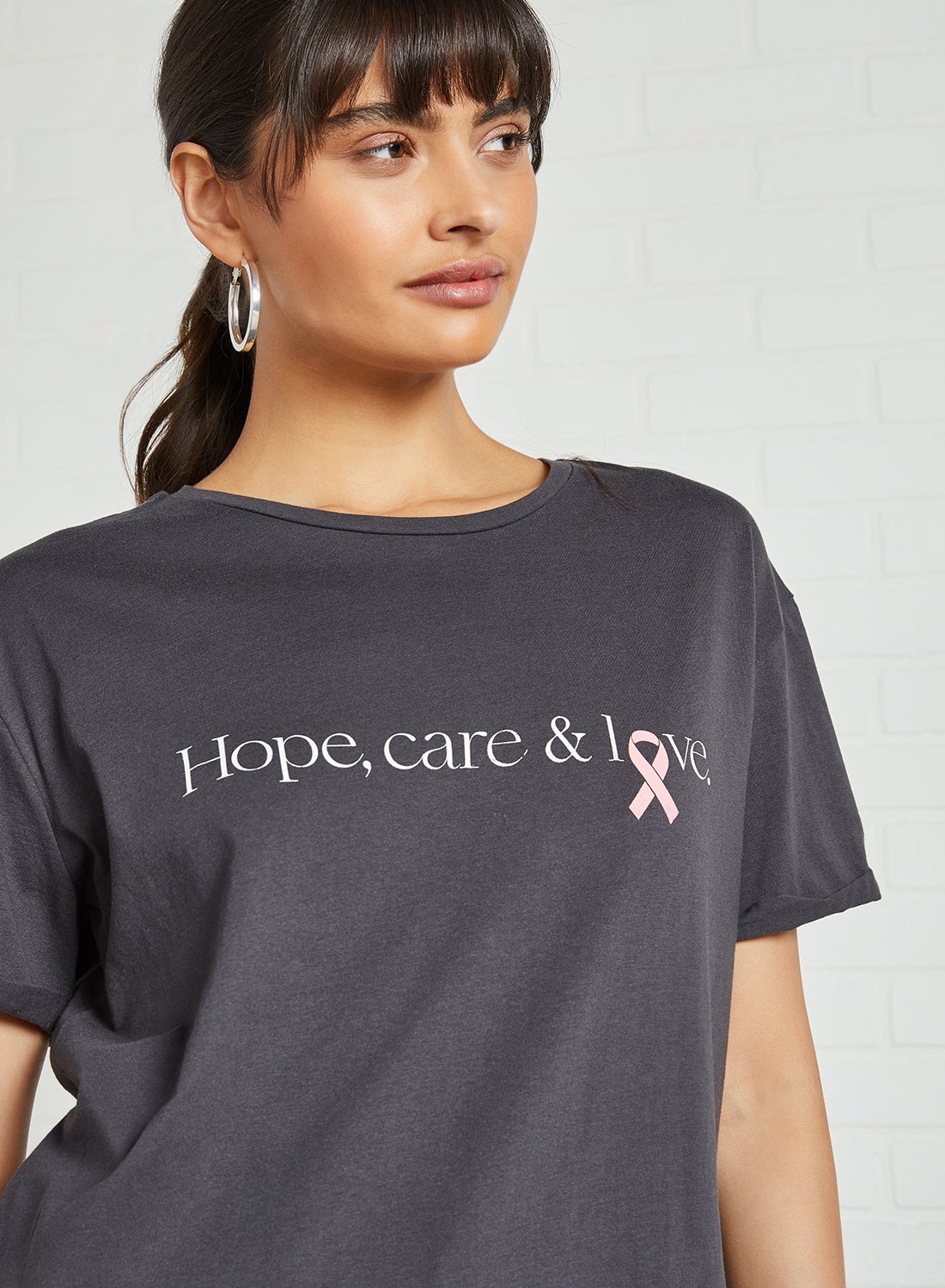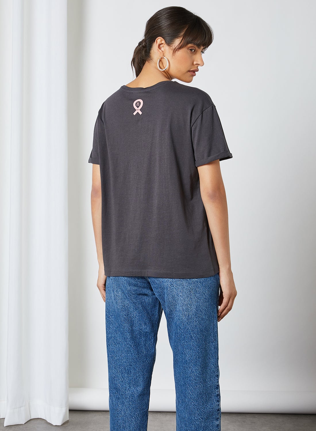 This product features a rounded neck cut and short sleeves, with a printed message. It is made entirely from 100% organic cotton.