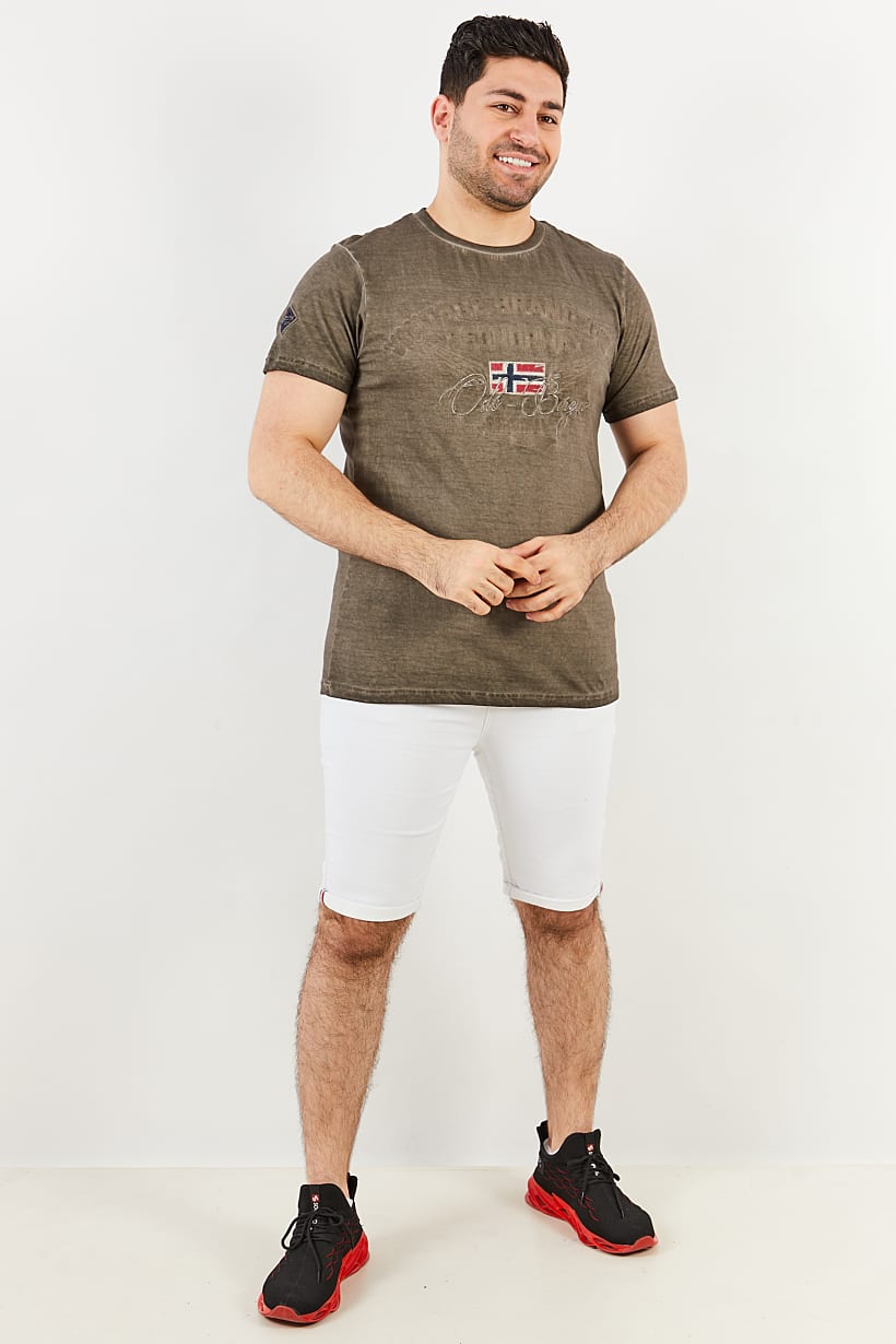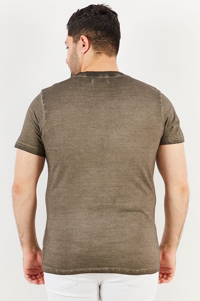 Dark Khaki Textured T-Shirt for Men with Round Neck and Short Sleeves.