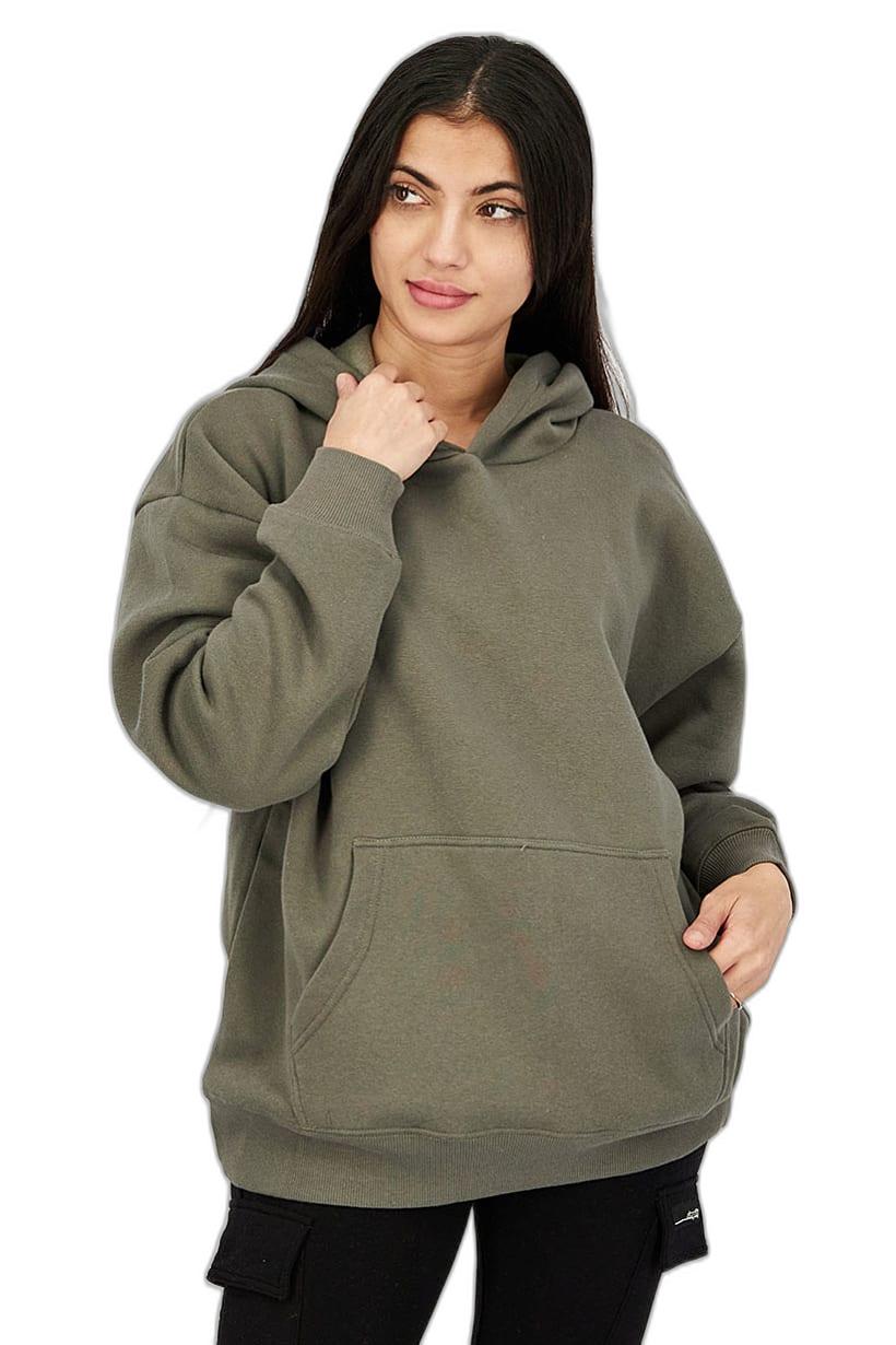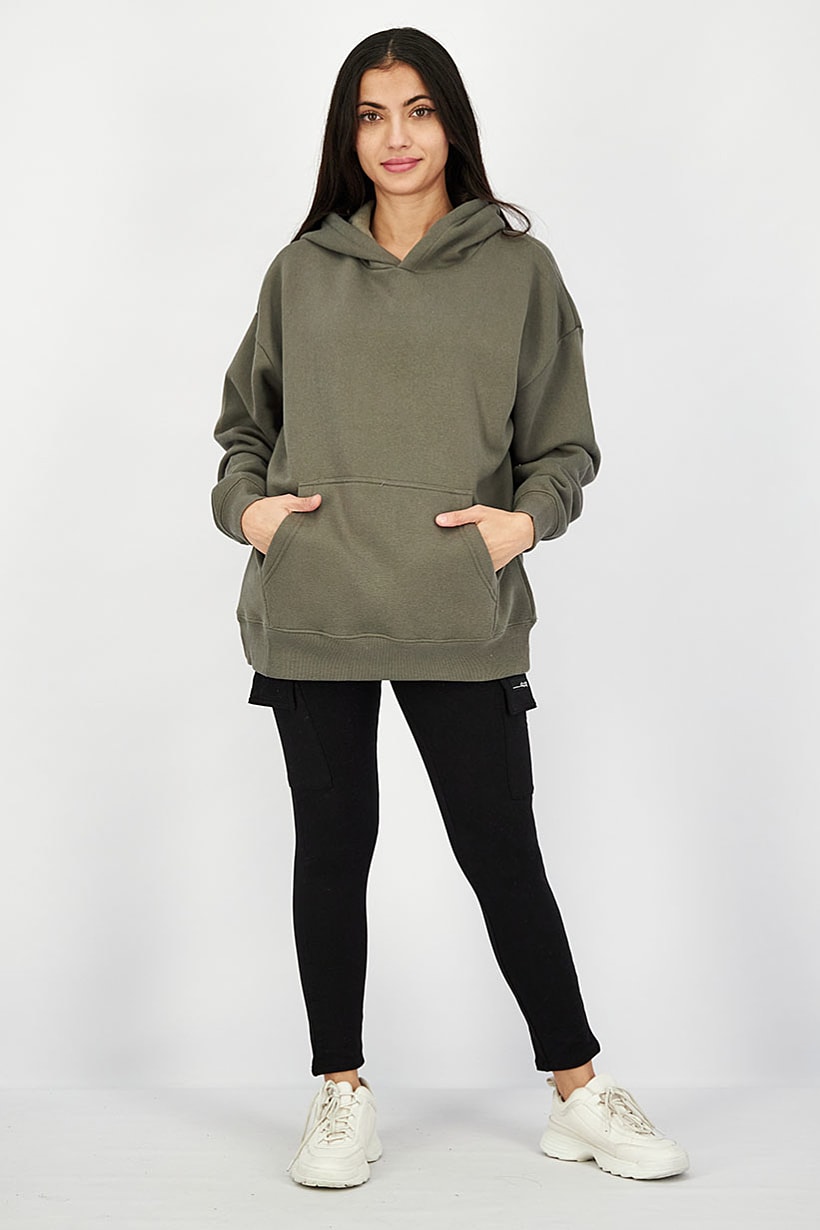 Women Clothing, Sportswear, women hooded front pocket plain sweatshirt dark olive