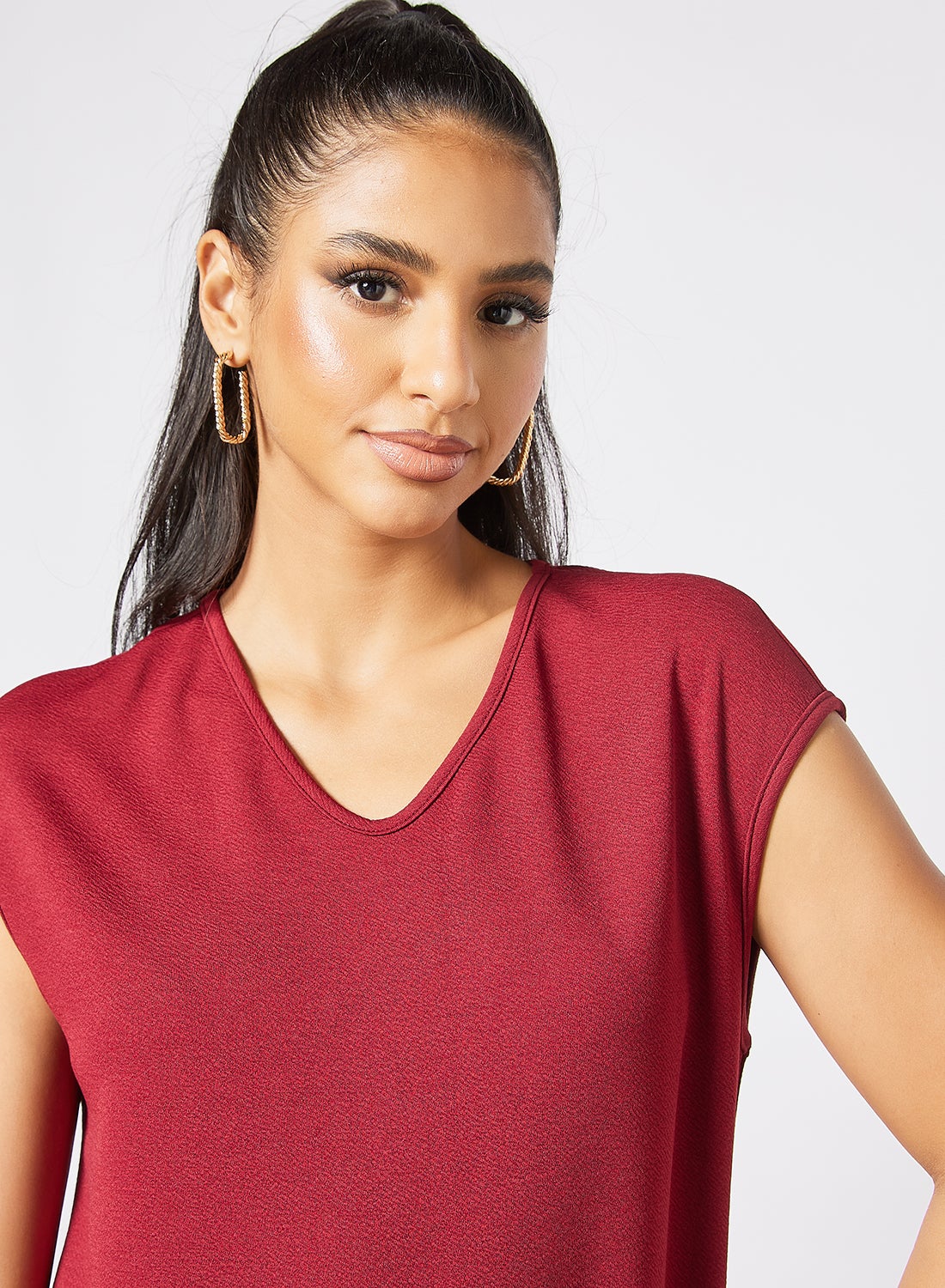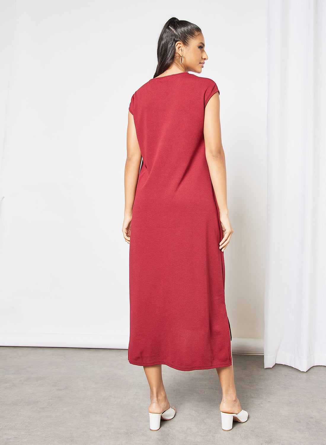Dark Red Sleeveless Maxi Knit Dress with V-Neck for Evening Wear.