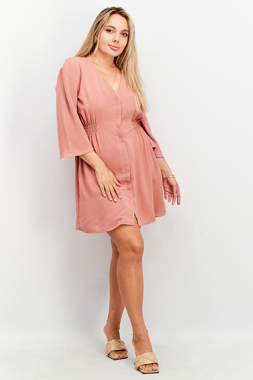 | descriptionOriginal | Care : Machine washable, Dress Style : Midi, Fit : Regular fit, Size shown : UK, Types of Hem : Straight hem, Types of Neckline & Collar : V-neckline, Types of Sleeve : Flared sleeve, Fabrics : 100% Polyester, Occasion : Casual, Pattern & Print : Textured pattern, Types of Closures : Button, Color Family : Pink, |