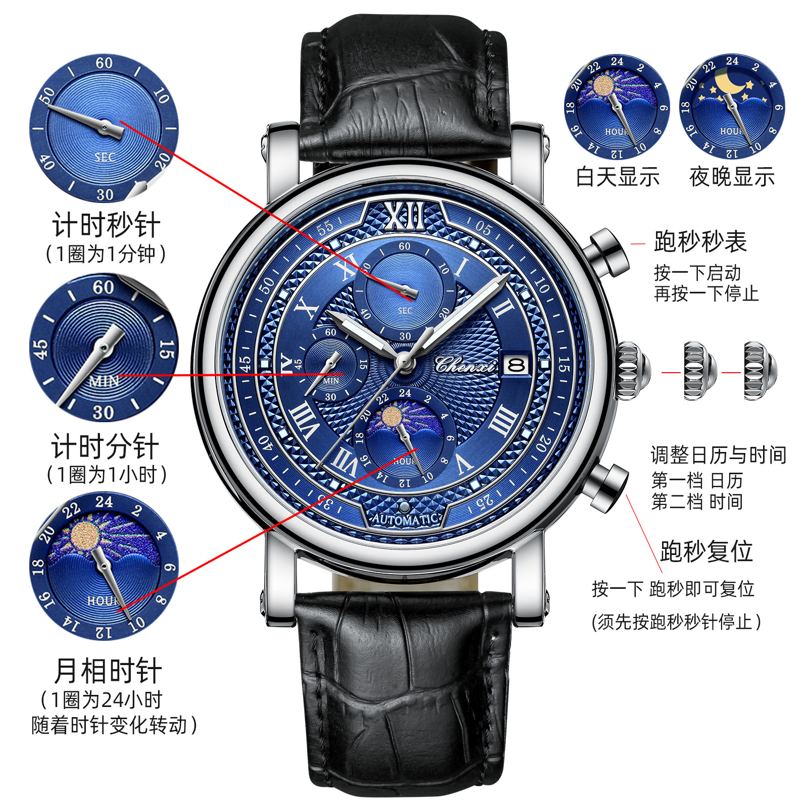 Dawn multifunctional real three-eye six-pin men’s watch moon phase calendar timing Business live cross-border manufacturers quartz watch