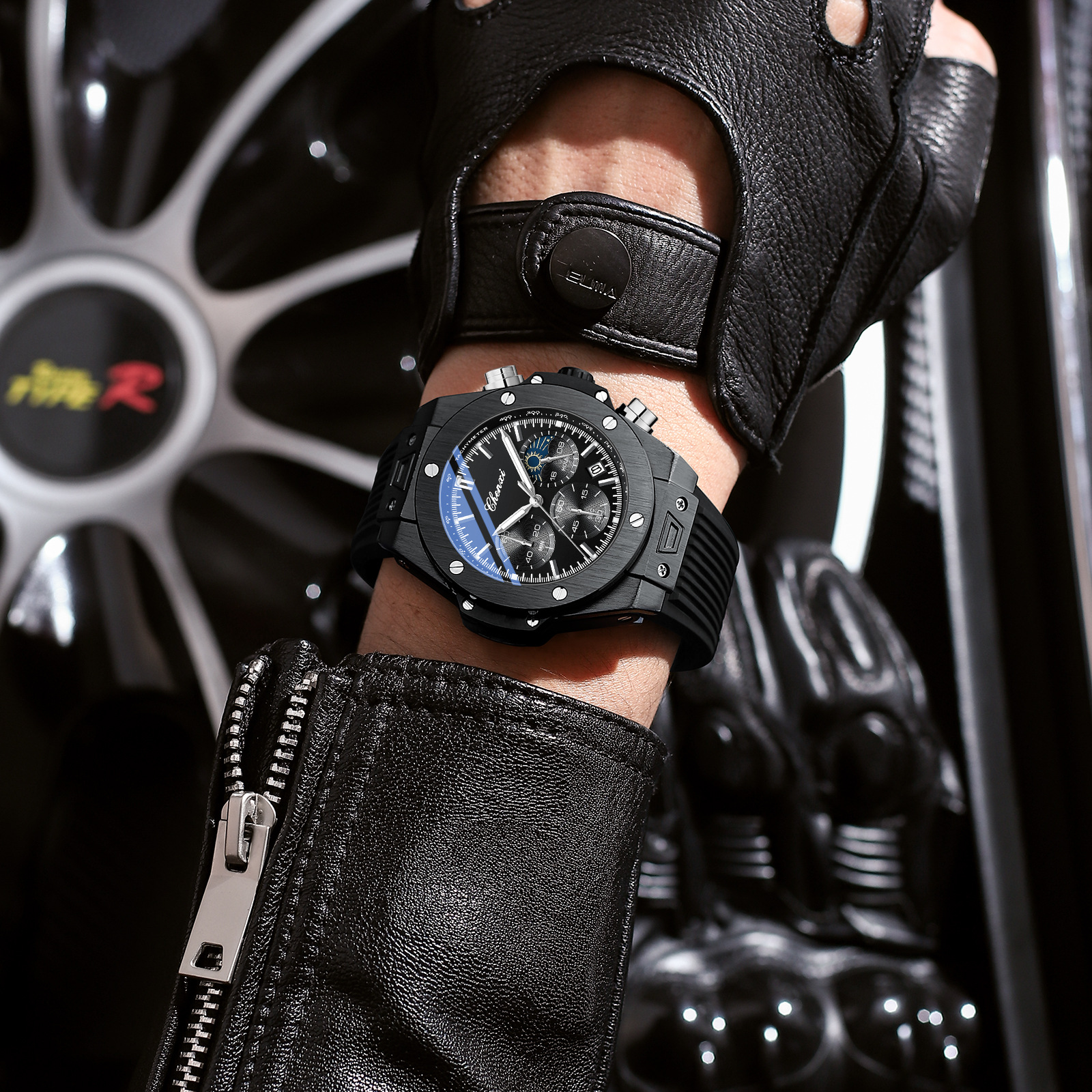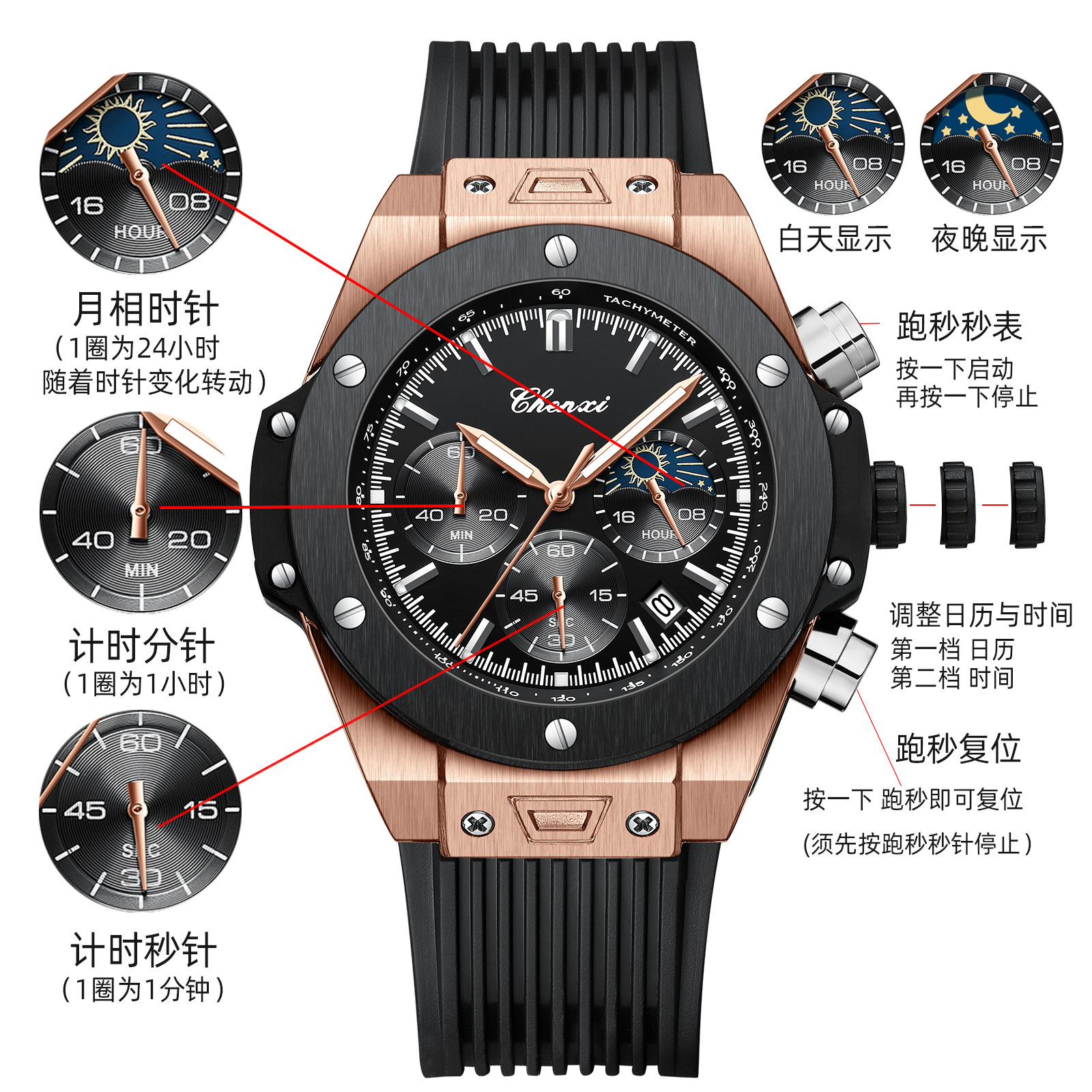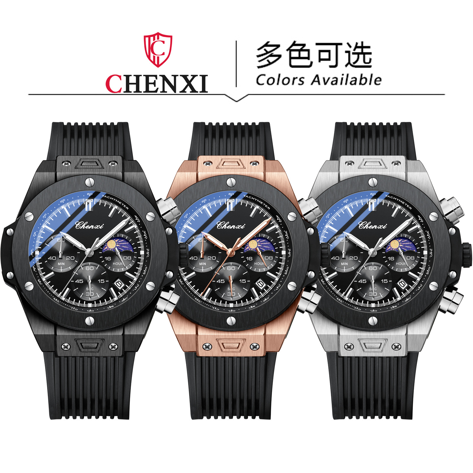 | nameOriginal | Dawn New Rivet Cool Multifunctional Men's Watch Moon Phase Chronograph Calendar Silicone Strap Quartz Watch Men |