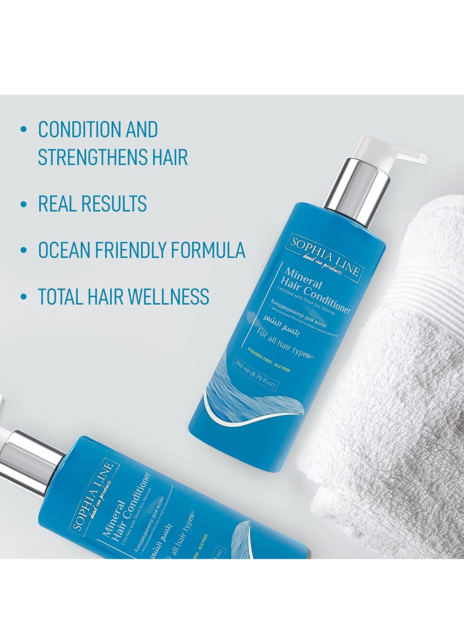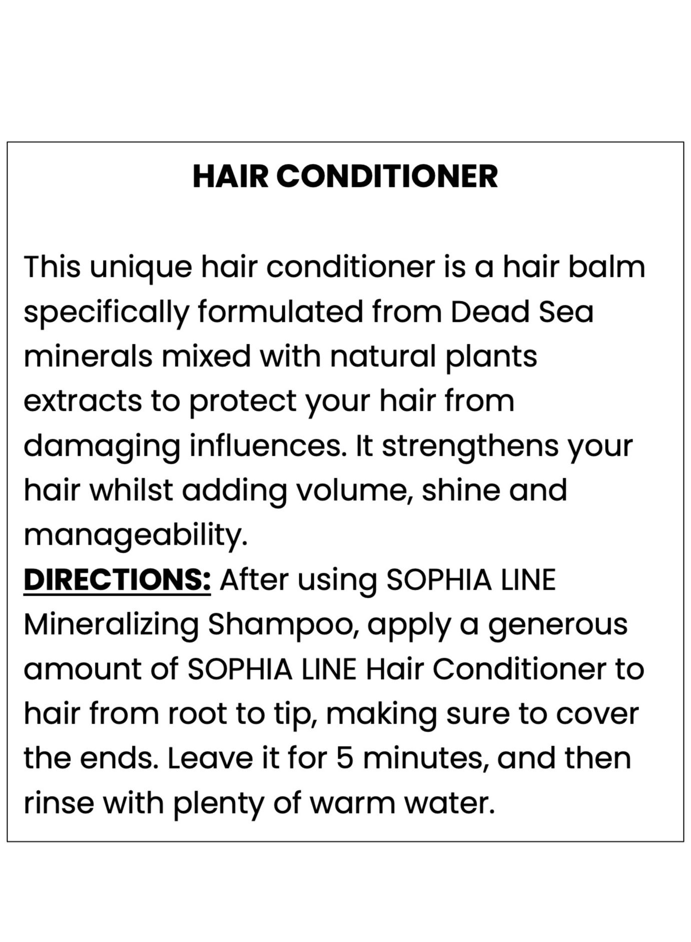 The SOPHIA LINE Dead Sea Mineral Hair Conditioner is a luxurious and nourishing hair care product that is designed to provide your hair with the ultimate hydration and nourishment it needs. Infused with the natural goodness of Dead Sea minerals, this conditioner is perfect for all hair types and is especially beneficial for those with dry, damaged, or color-treated hair.