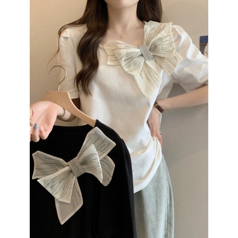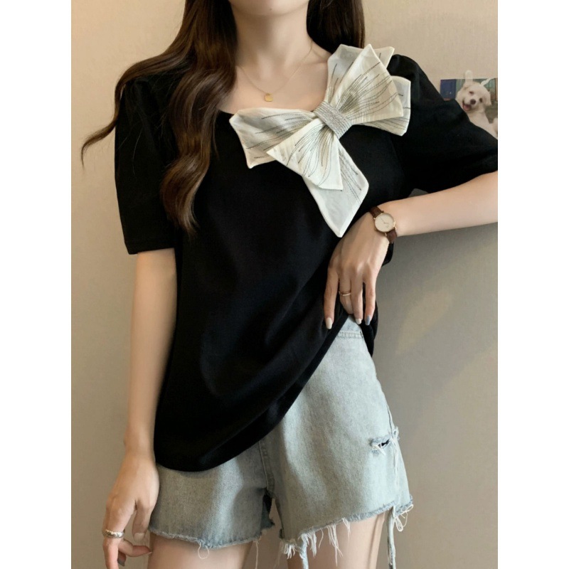 | nameOriginal | Decorative Bow T-shirt Women's Summer plus size Chubby Personality Design Niche Short-sleeved Shoulder Chic Top |