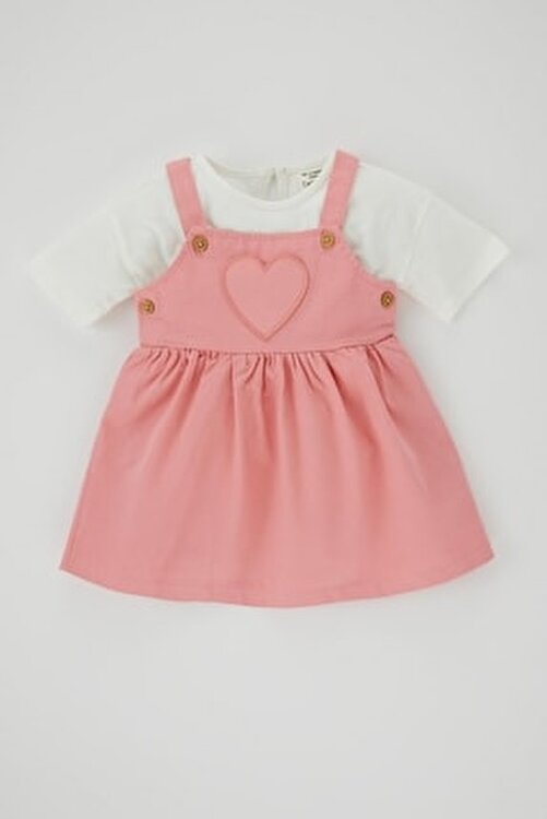 Pink gabardine fabric, adjustable straps, heart embroidery dress, cotton fabric, crew neck, short sleeve t-shirt and long pantyhose model for your baby at parties, baby shower celebrations, birthdays with 3 set model DeFacto Baby Girl Salopet Dress Short Sleeve T-Shirt Socks Set of 3. The product is sold together with socks.