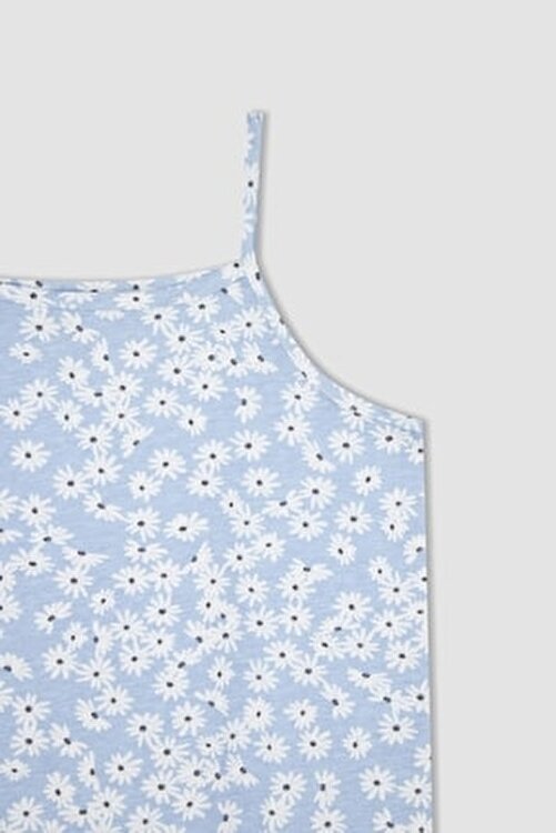 DeFacto Girls’ Regular Fit Patterned Sleeveless Cotton Combed Dress With Cotton Fabric, Square Neckline, Strap, Cat Printed Blue Short Length Regular Fit Model With Patterned Combed Fabric You Will Prefer In Home Wear And Sleepwear.