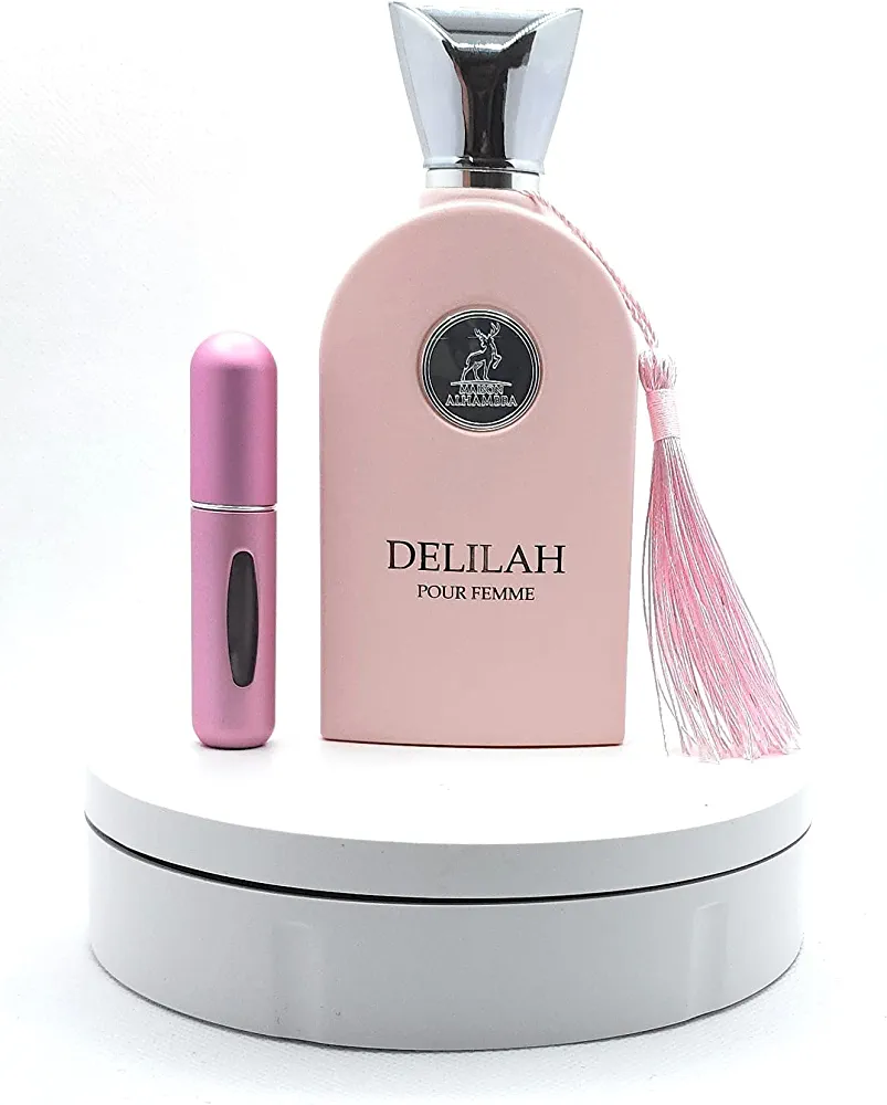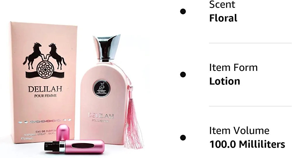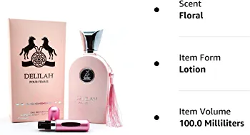 | descriptionOriginal | Description DELILAH EAU DE PARFUM BY MAISON ALHAMBRA, DELICIOUS WOMAN FRAGANCE, 100ML, 3.4 FL, OZ. Dalilah's fragrance conveys a message that connects you with your abilities, your creativity, your inspiration and your strength. It is one of the highest vibrations among the essences. *A pretty, Pink and Purely Feminine Floral EAU de Parfum that will warm your heart and make you feel like royalty. Primary notes: Bergamot, lychee & rhubarb. Base notes: vanilla, white musk and cashmere. Middle notes: peony, wild lily & rose. |