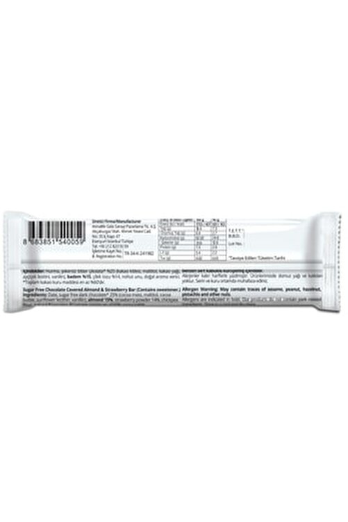 bar with almonds and strawberries, covered with unsweetened chocolate. Contents:Date palm, unsweetened dark chocolate 25% * (cocoa mass, maltitol, cocoa butter, sunflower lecithin, vanillin), almonds 15%, strawberry powder 14%, chickpea flour, natural flavoring. *Total cocoa dry matter is at least 60%. There’s no “wish”, “good thing” a lot!