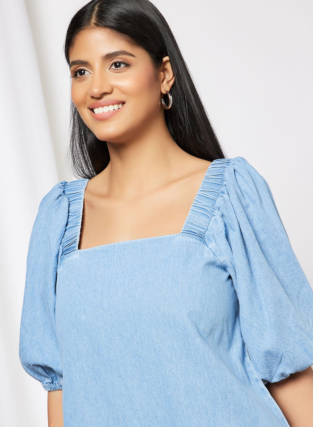 This product is a part of Mango’s Committed collection and is made of soft and comfortable cotton denim fabric. It features a square neck and short puff sleeves, with a relaxed fit and mini length. To ensure proper care, please follow the instructions on the care label. The model is approximately 180cm tall and is wearing a size S.