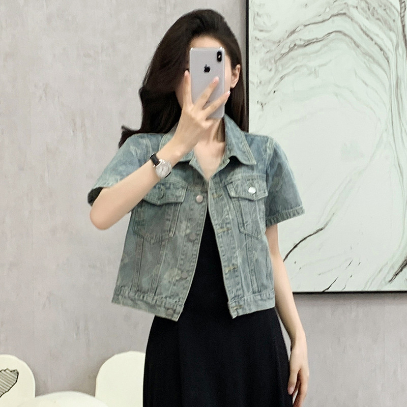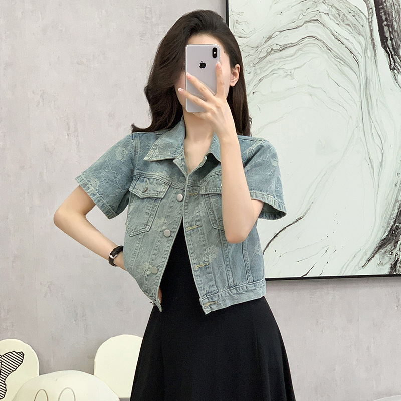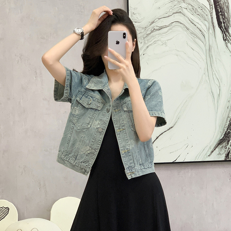Denim Flower Embroidered Jacquard Bump Embossed Short Short Sleeve Summer New Jacket Top