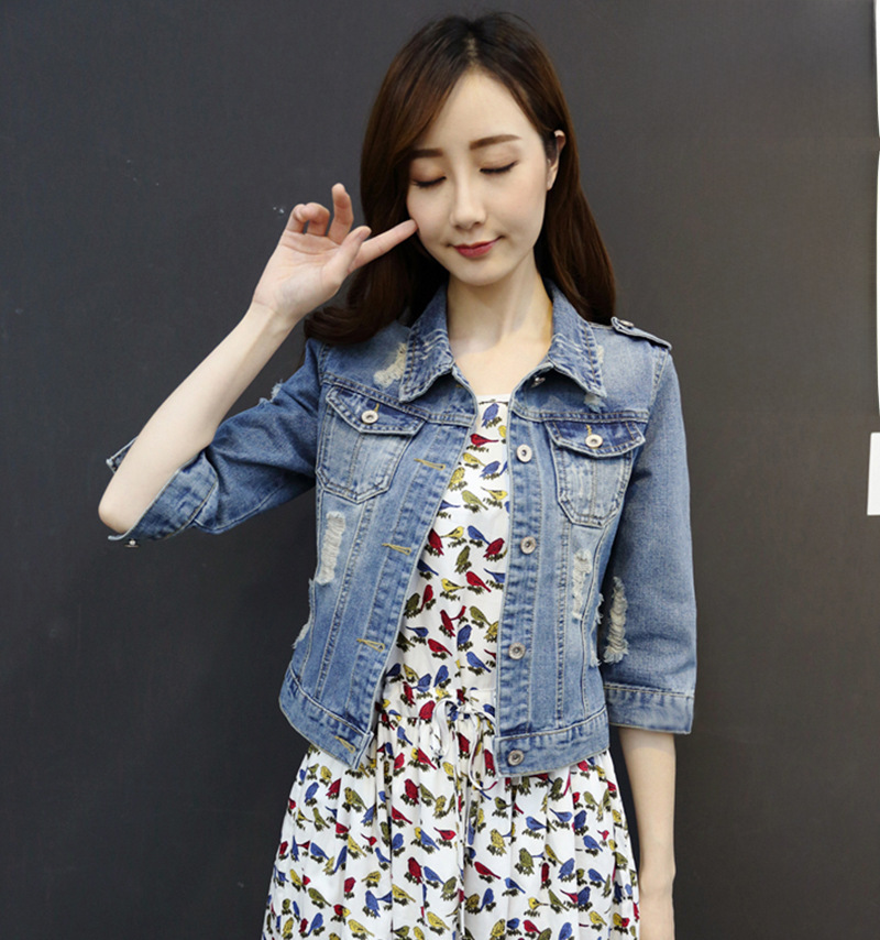 | nameOriginal | Denim Jacket Women's Short Slim-fit Korean-style Trendy All-match Seven-point Sleeve Spring and Autumn Jeans Long-sleeved Top Large Size with Ripped Holes |