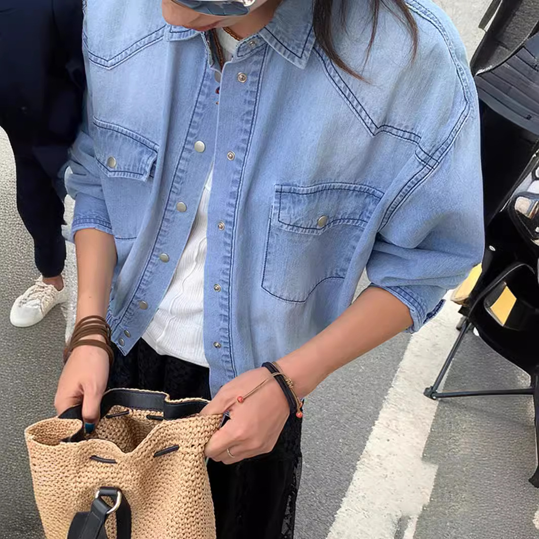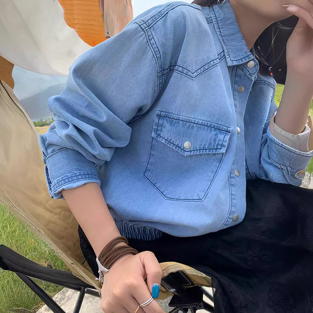 Denim Shirt Coat Women’s 2024 New Top Hong Kong Style Retro Casual Loose Lazy Short Shirt