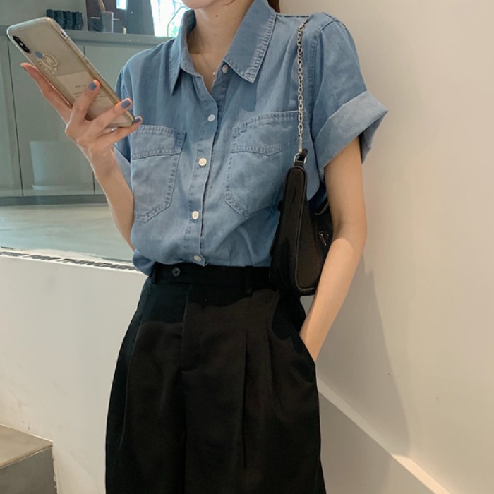 | nameOriginal | Denim Short-sleeved Shirt Women's Summer French Retro All-match Small Design Niche Half-sleeved Polo Shirt Top |