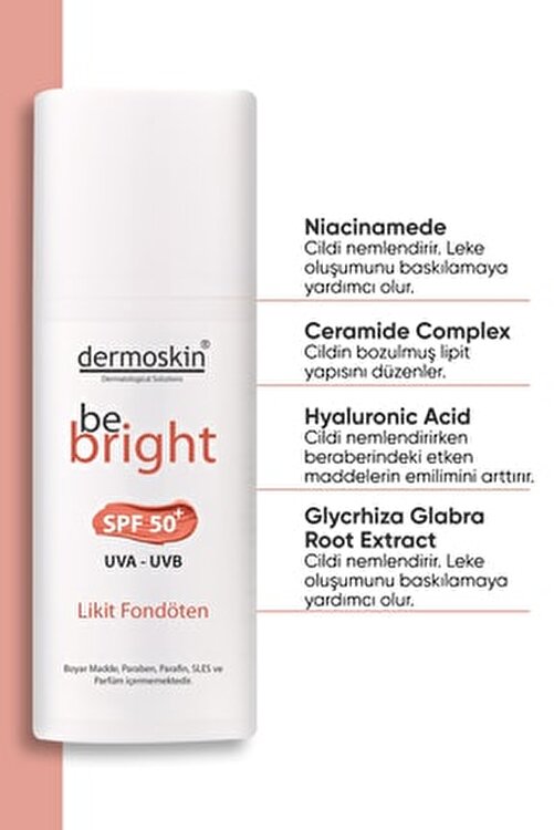 Be Bright SPF50+ Liquid Foundation Dermoskin Liquid Foundation is suitable for all skin types and closes skin imperfections with its intense concealer. It gives a smooth appearance. Can be used on acne skin. Suitable for use for all skin types. MEDIUM — For brunet-skinned skin. LIGHT — For white skin, the UVA effect is strengthened with Titan Dioxide (mineral filter), Avobenzone, Tinasorb S filters, which together with other filters provide strong protection on the skin against SPF 50+ UVA/UVB rays. Thanks to the active substances of anti-aging properties, it helps to increase the elasticity of the skin, remove fine wrinkles and tighten the pores. It can also be safely used around the eyes to cover under-eye defects (dark circles and fine wrinkles). It is compatible with the skin and spreads easily, the persistence and concealment continues throughout the day. It does not cause the formation of comedones. Rosacea, Vitiligo Melasma can be safely used after “aesthetic surgery” and “medical aesthetic” applications (Laser, Peeling, PRP and other applications) with the effect of suppressants, strong humidifiers, concealers and SPF 50+ UVA-UVB protectors. Does not contain Paraben, Paraffin, SLES and Perfume. APPLICATION Apply a sufficient amount of the product after cleansing your skin, spreading it evenly over your entire face without contact with your eyes. At the end of the day, we recommend cleansing your makeup and skin with Dermoskin Be Bright Illuminating Tonic. WARNINGS Externally used.