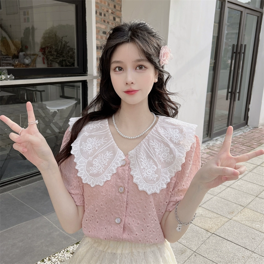 | nameOriginal | Design niche pink short-sleeved doll collar shirt |