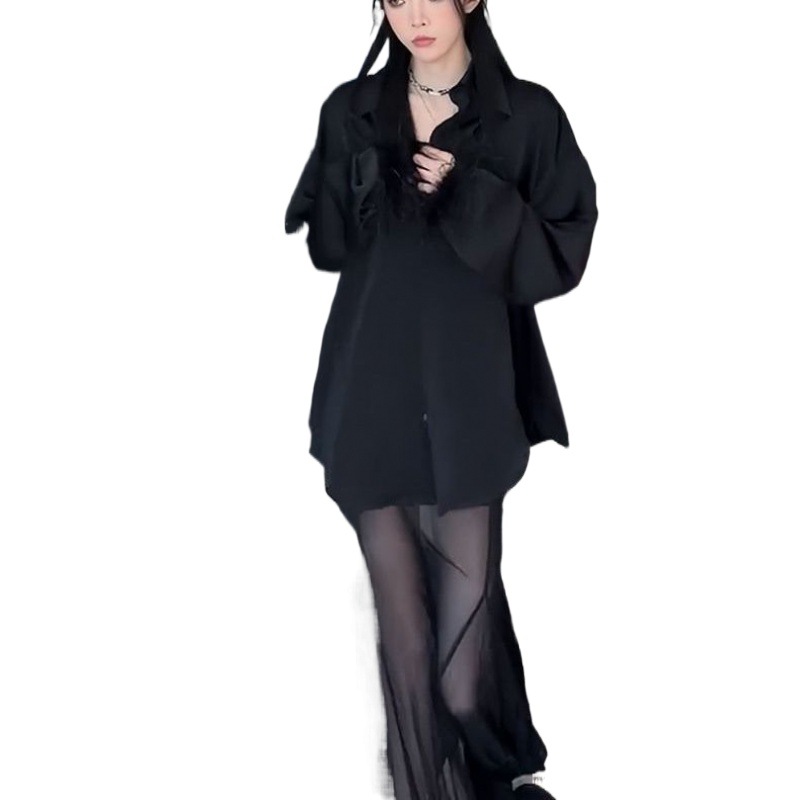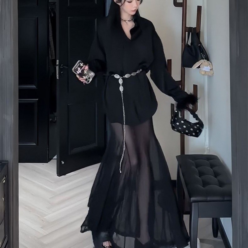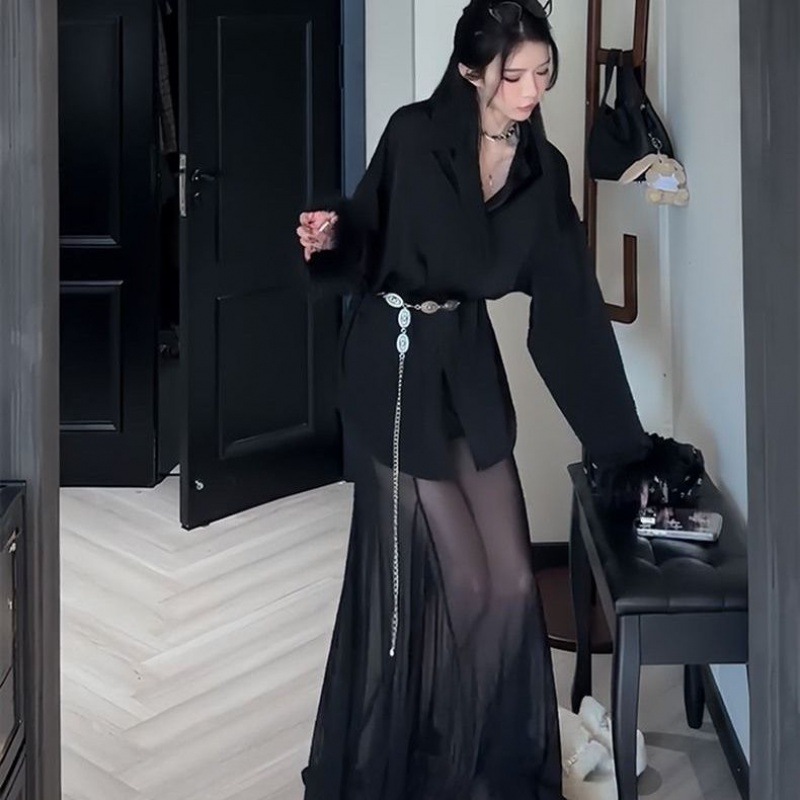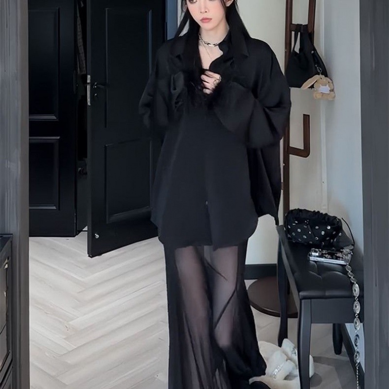 Design Retro Hot Girl Black suit Women's Spring and Summer New Loose Shirt Mesh Stitching Long Dress Two-piece Set for Women