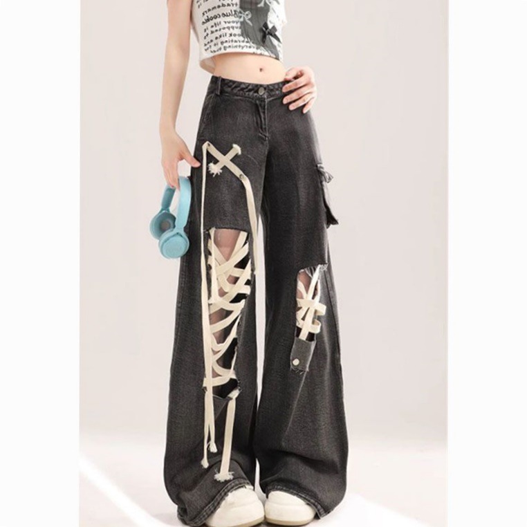 | nameOriginal | Design Sense American Style Black Strap Ripped Jeans Women's Summer Workwear Wide Leg Loose Long Pants |