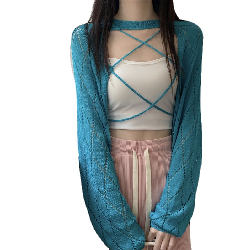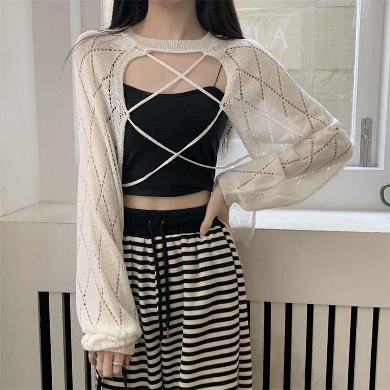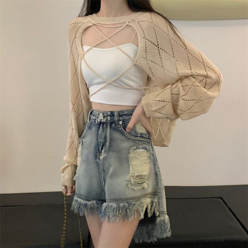 Design Sense Cross Hollow Knitted Blouse Women’s Summer New Sunscreen Clothing Sweet Spice Girl High Waist Niche Short Top