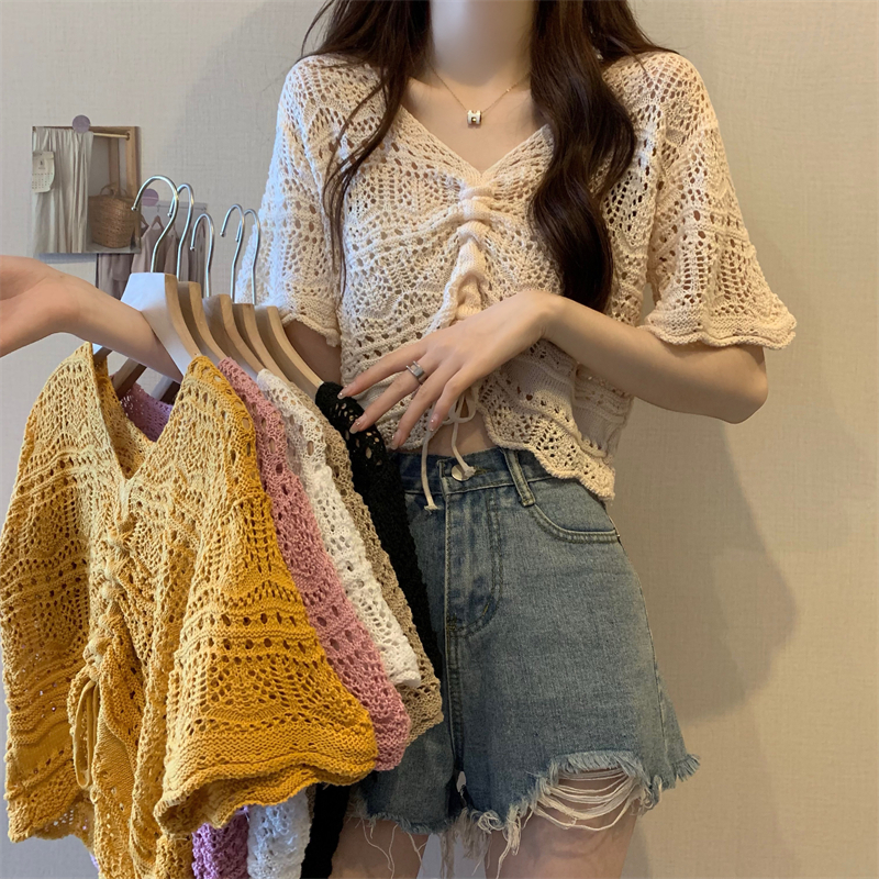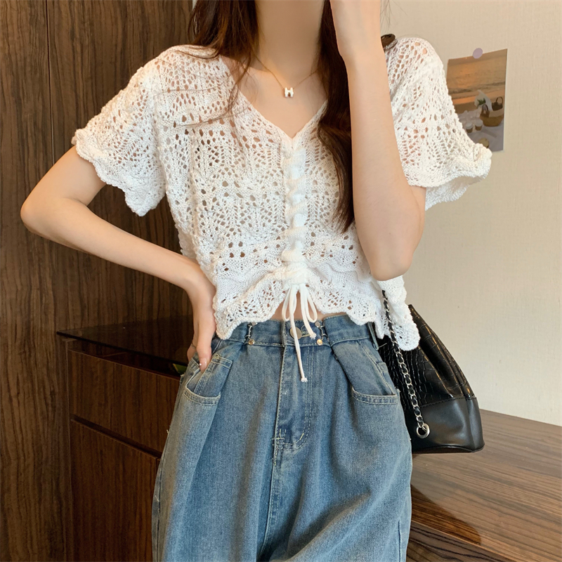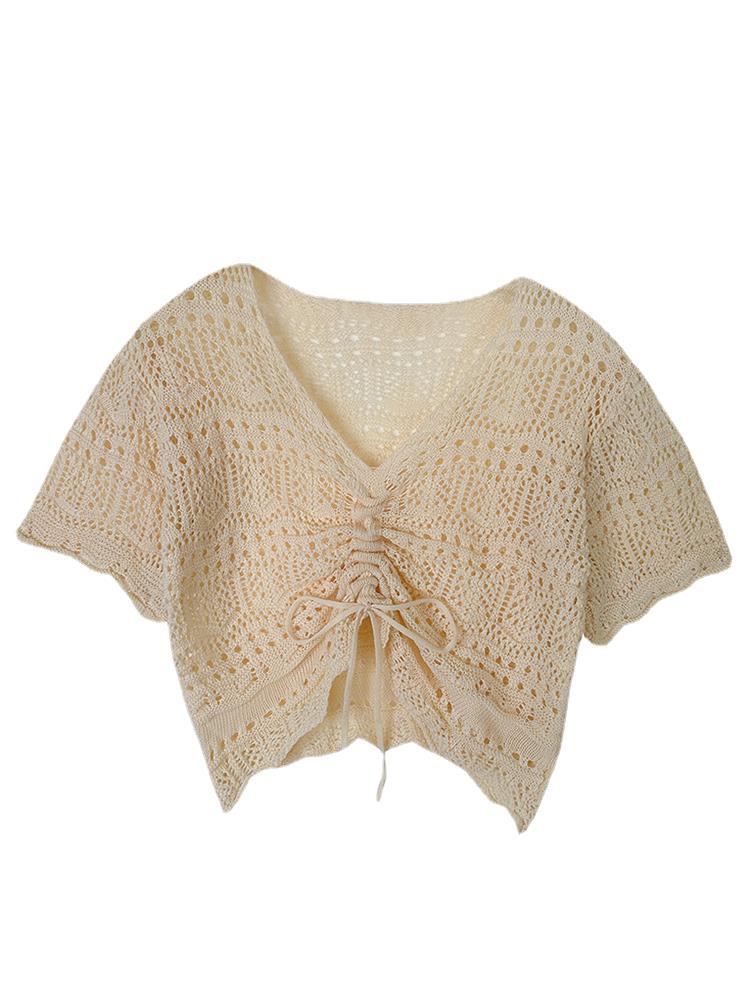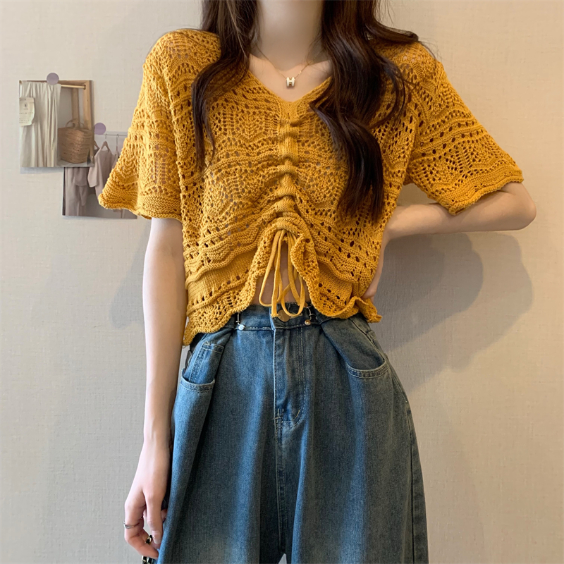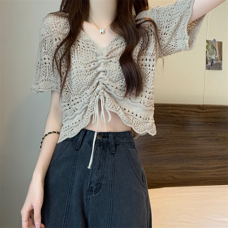 Design Sense Hollow Drawstring V-neck Short-sleeved Knitted Blouse Thin Women's 2024 Summer New Niche Short Top