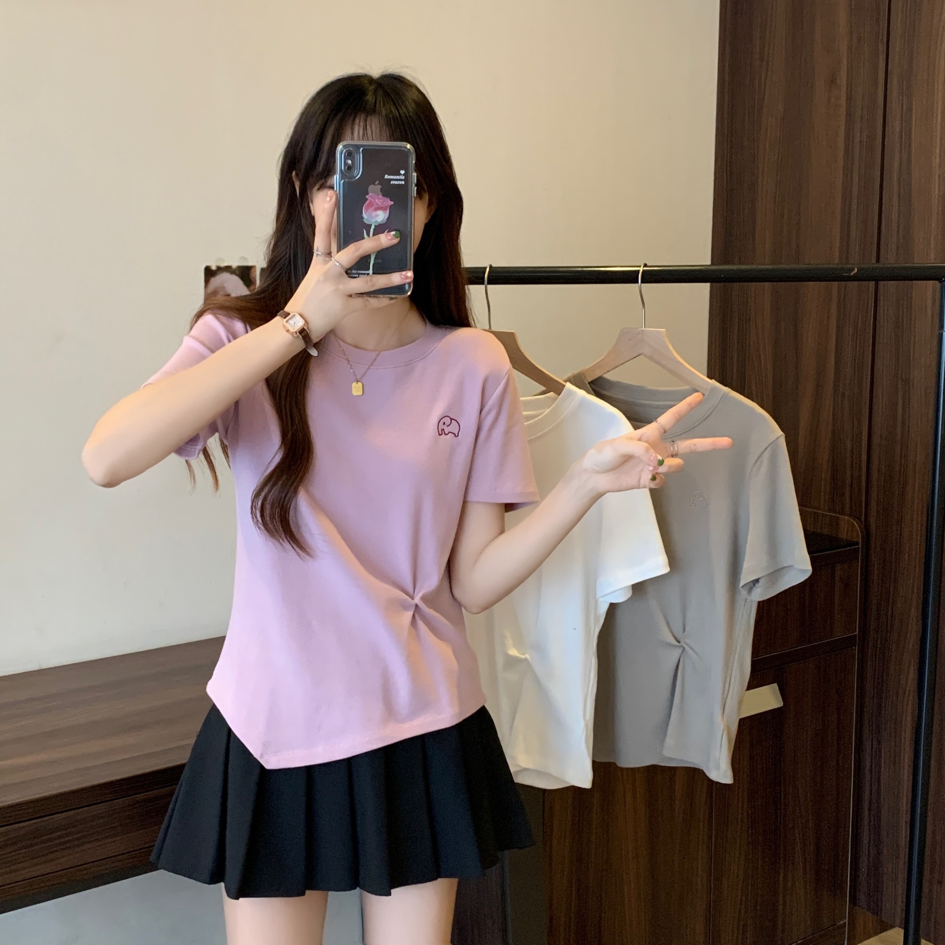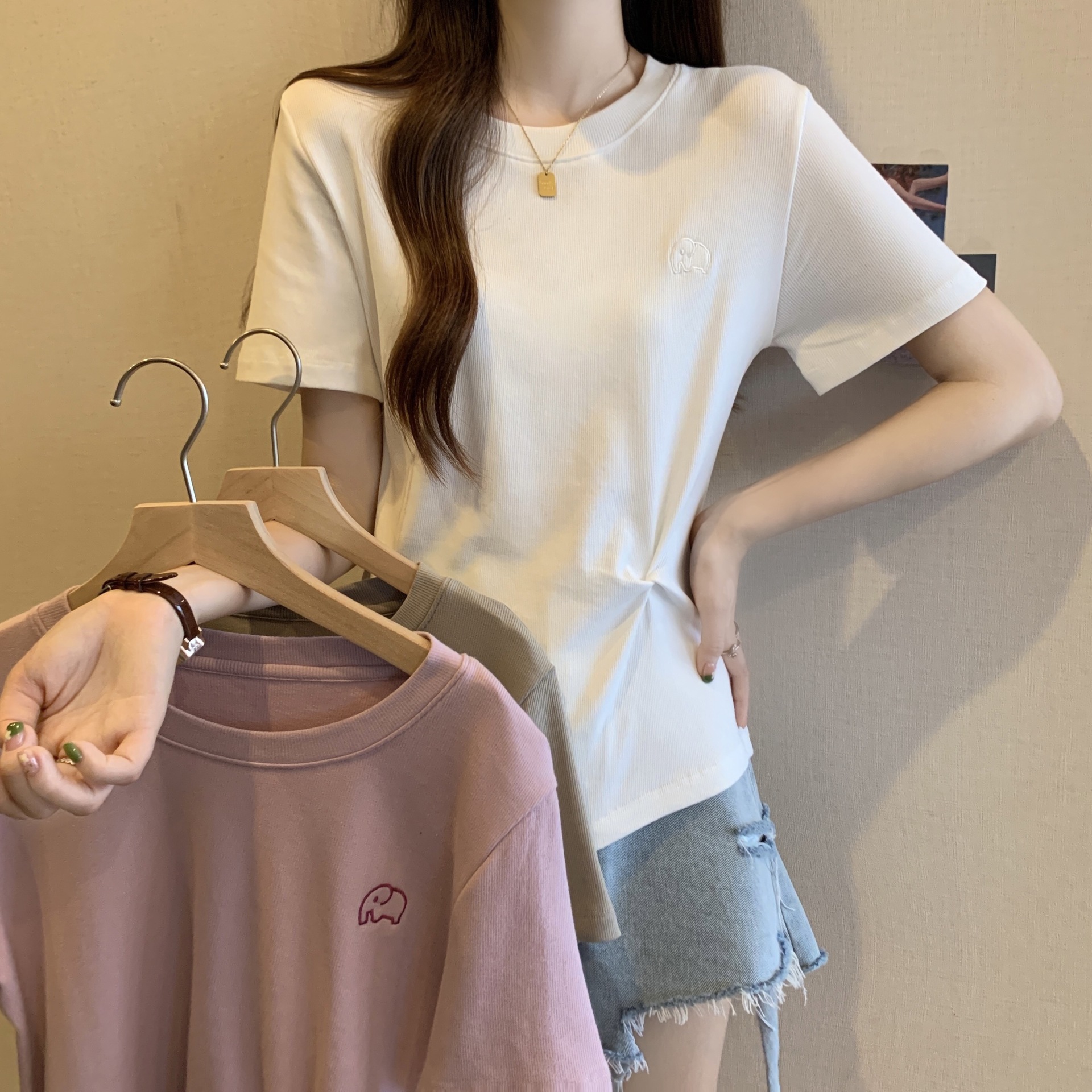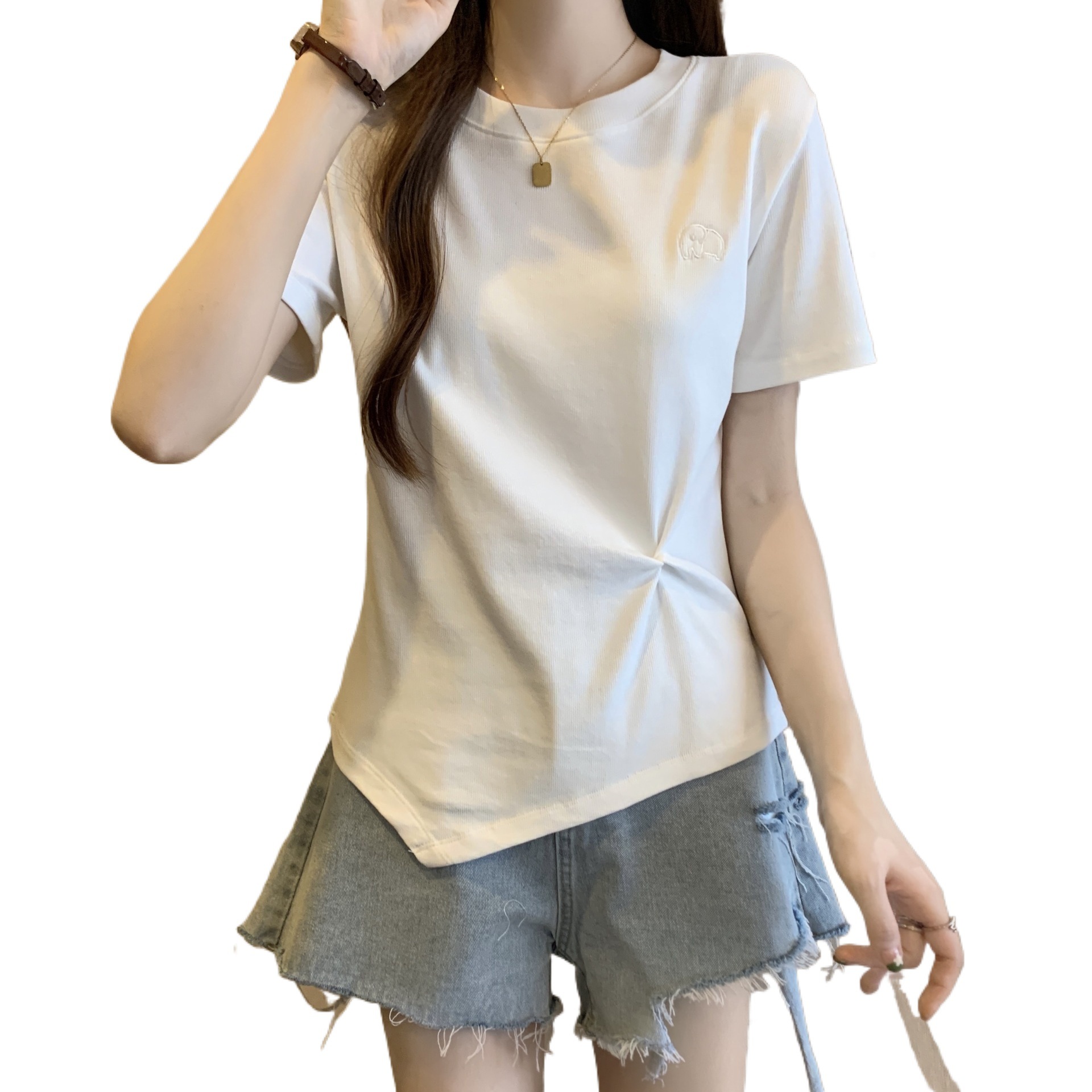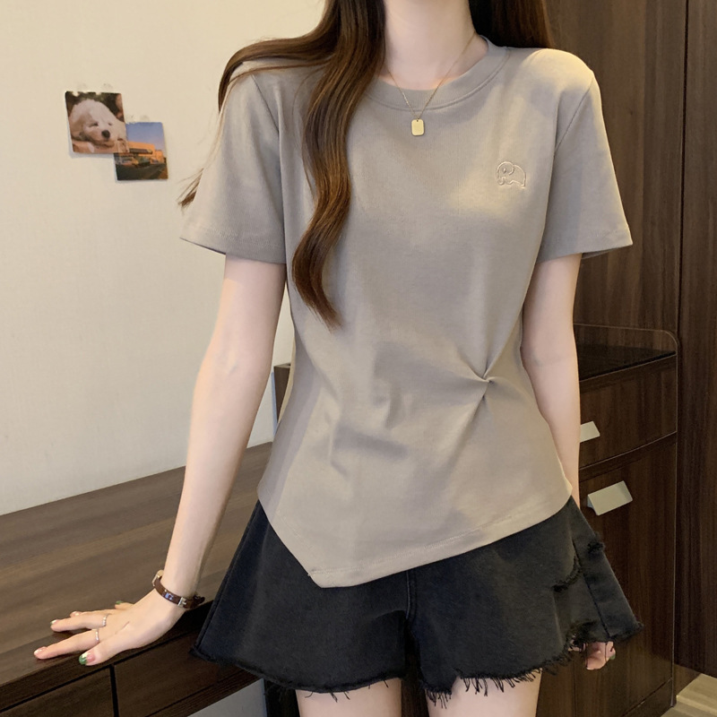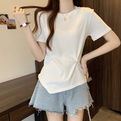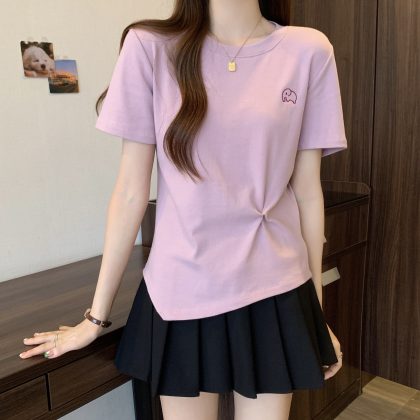 Design Sense Irregular Short-sleeved T-shirt Women’s Summer plus size chubby girl Slim Belly Covering Pleated Sweet Shoulder Top