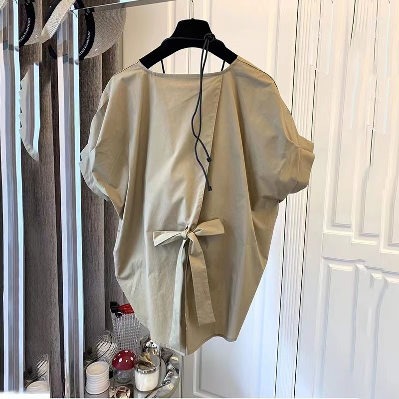 | nameOriginal | Design Sense Niche Korean Style Loose Casual French Style Split Strap Bow Pullover Short Sleeve Shirt Top for Women |