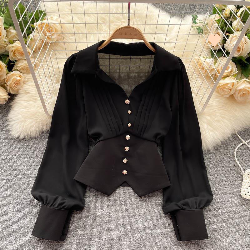 | nameOriginal | Design Sense Niche Ruffle Collar Long Sleeve Shirt Women's French Style Elegant Irregular Hem Bubble Sleeve Chic Top |