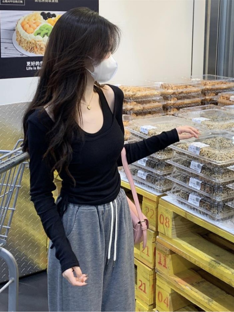 Design sense niche women's clothing 2024 spring long sleeve drawstring pure desire T-shirt halter vest top two-piece suit