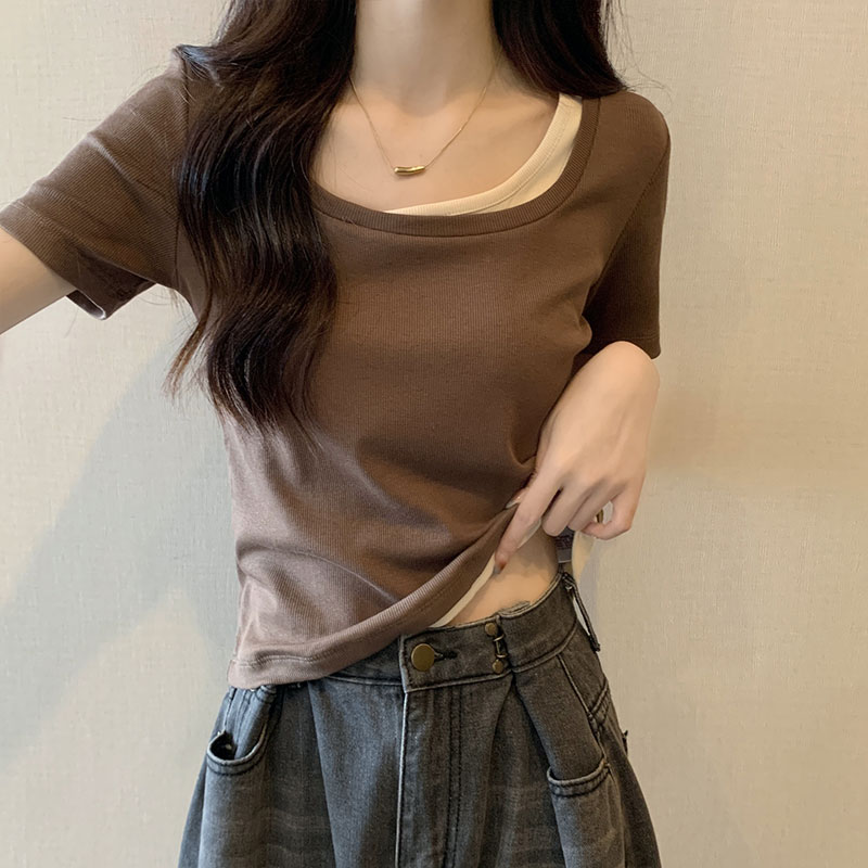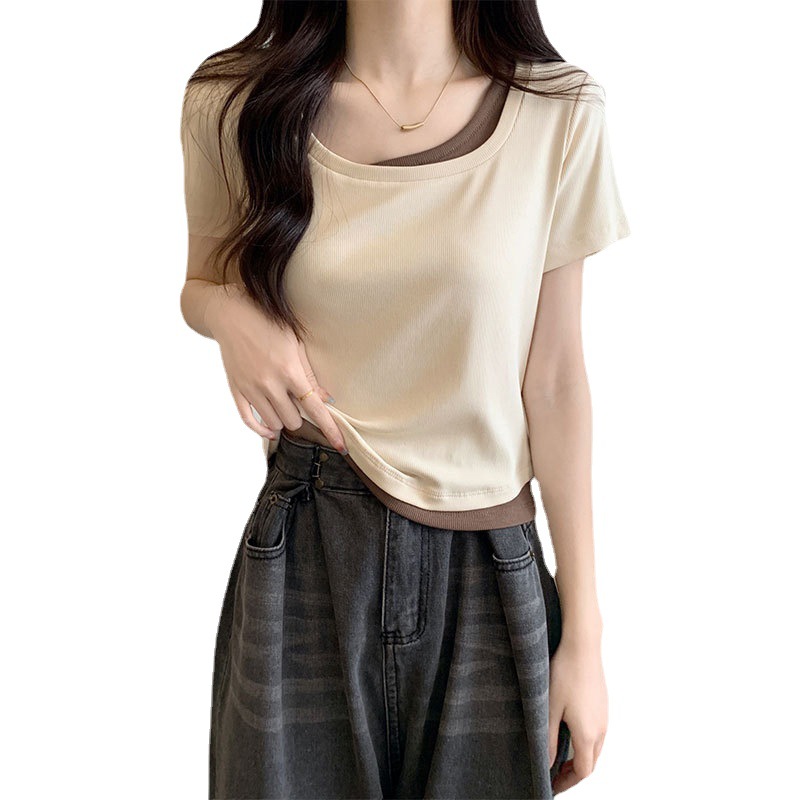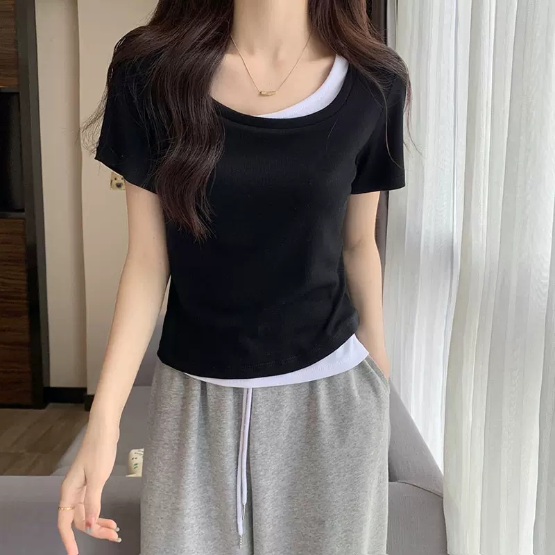 | nameOriginal | Design Sense Square Collar Fake Two-piece Short-sleeved T-shirt Women's Summer 2024 New Slim-fit Pure Niche Short Top |