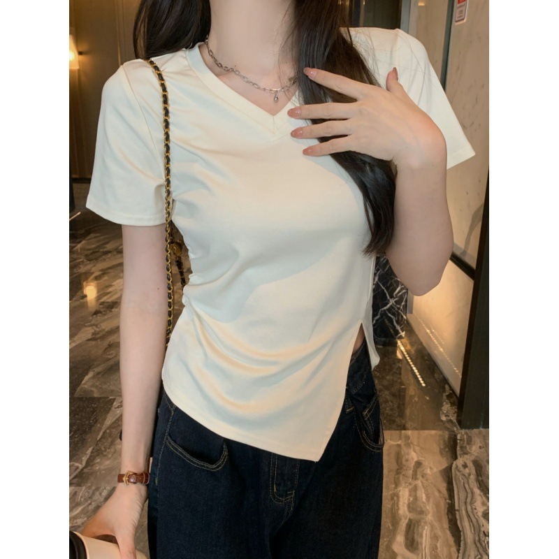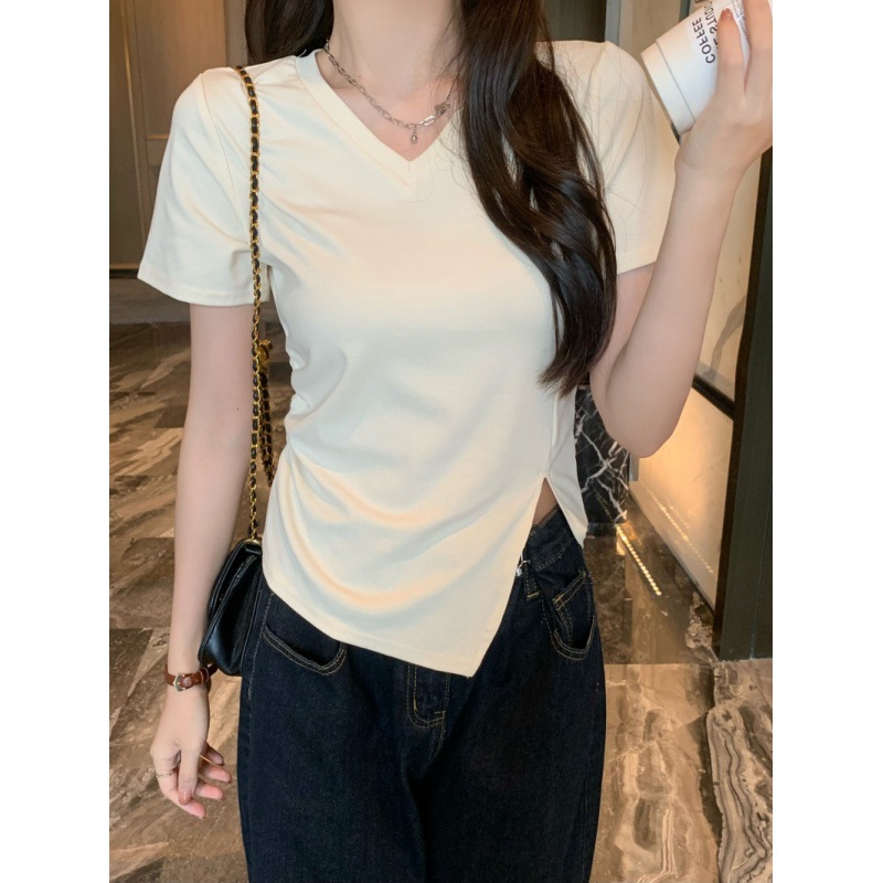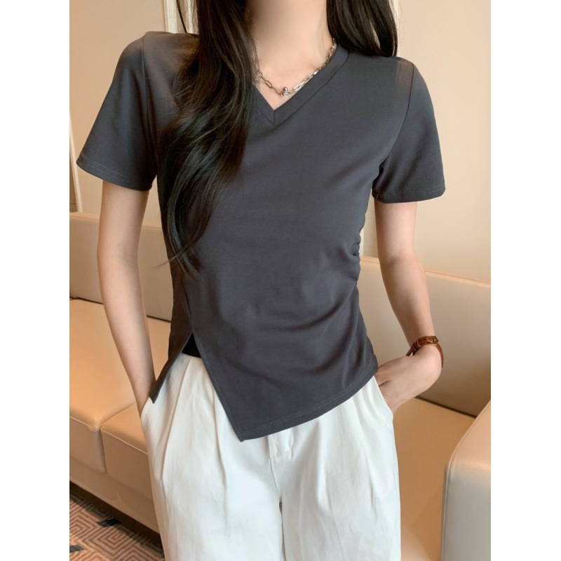 | nameOriginal | Design Sense V-neck Shoulder T-shirt Women's Summer Short-sleeved New Slimming Solid Color Split Irregular Niche Spice Girl Top |