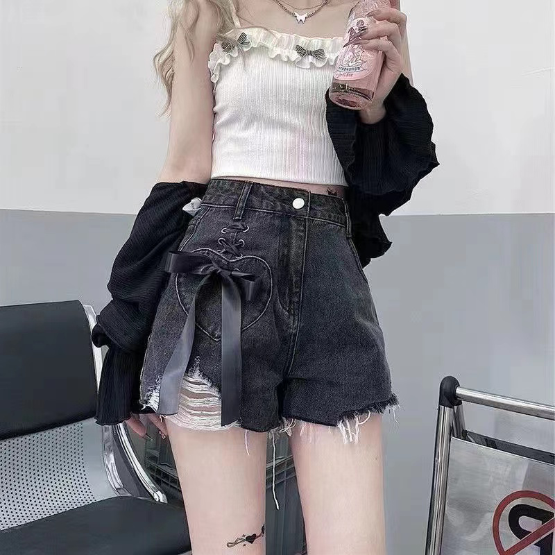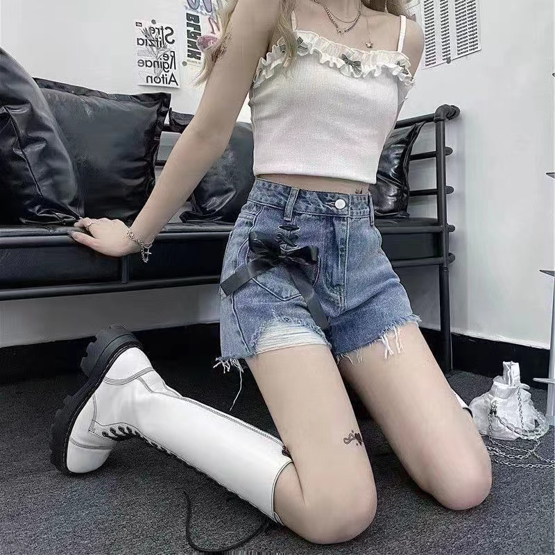 | nameOriginal | Designed bow tie ripped denim shorts for women in summer, tall and slim, loose high-waisted wide-leg A-line pants |