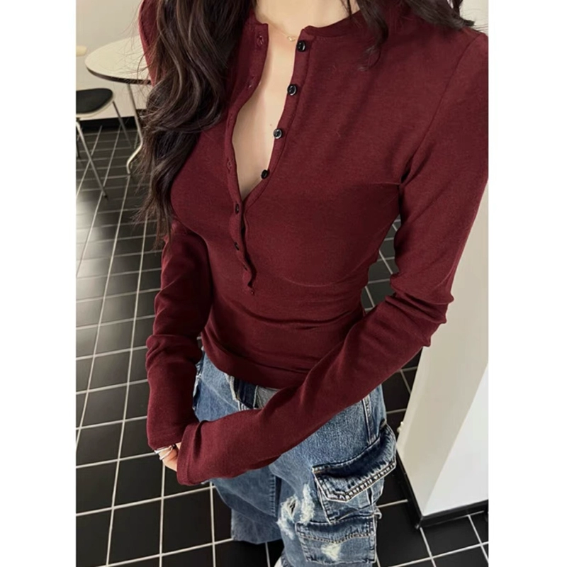 | nameOriginal | Designed burgundy long-sleeved V-neck inner bottoming shirt for women in autumn and winter new hot girl slim short top ins |