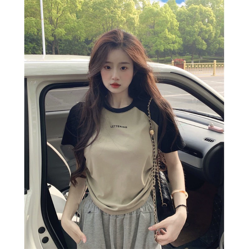 | nameOriginal | Designed color-blocked short-sleeved T-shirt for women in summer 2024 new round neck versatile right shoulder drawstring short loose top |