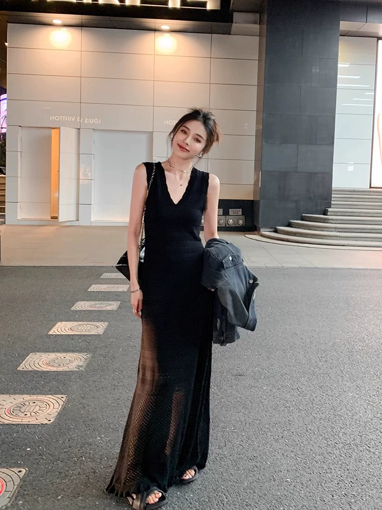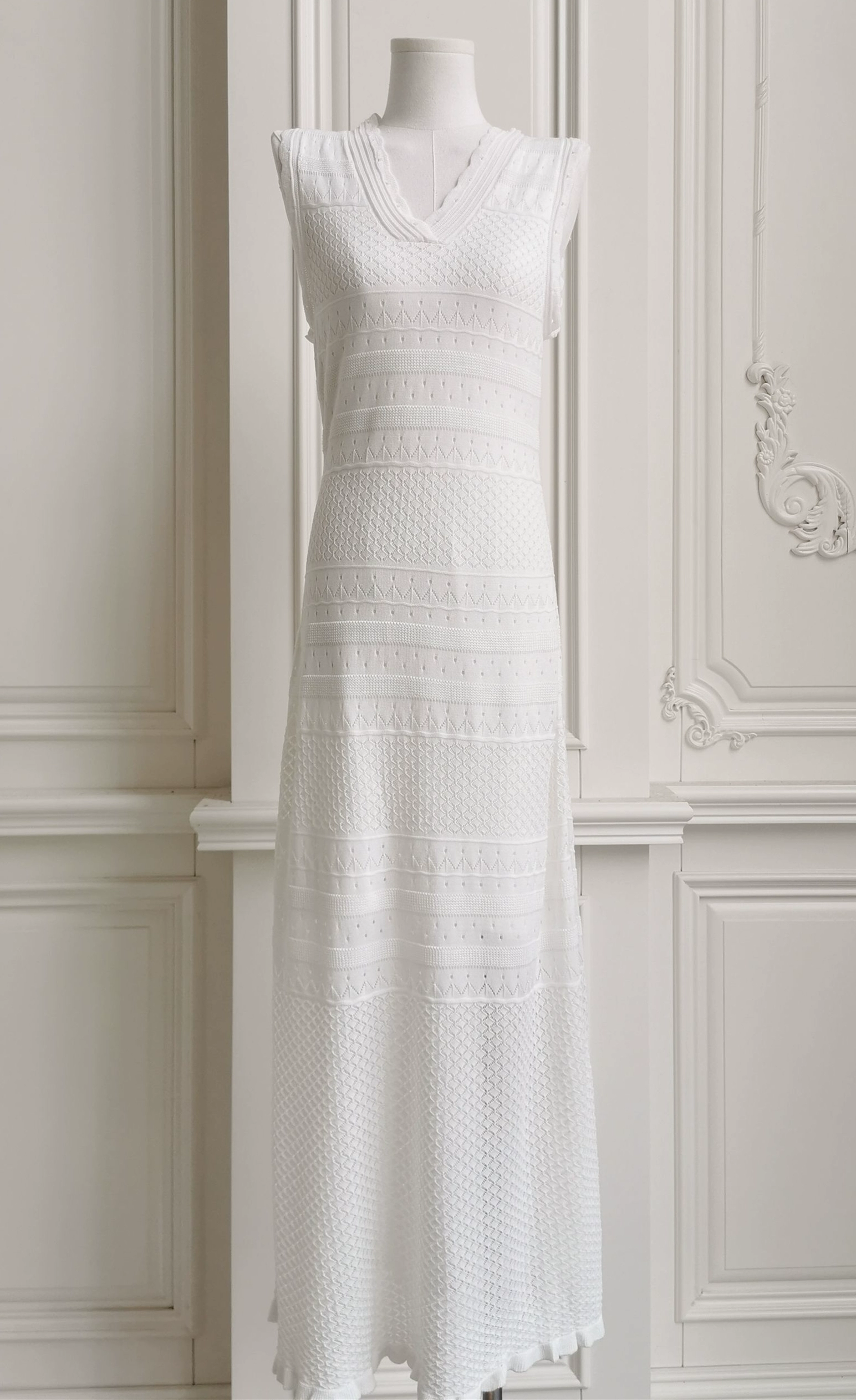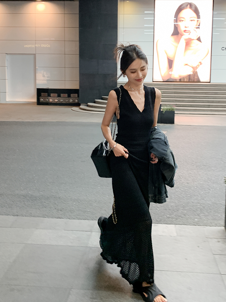 | nameOriginal | Designed high-waist V-neck hook pattern hollow French long skirt |