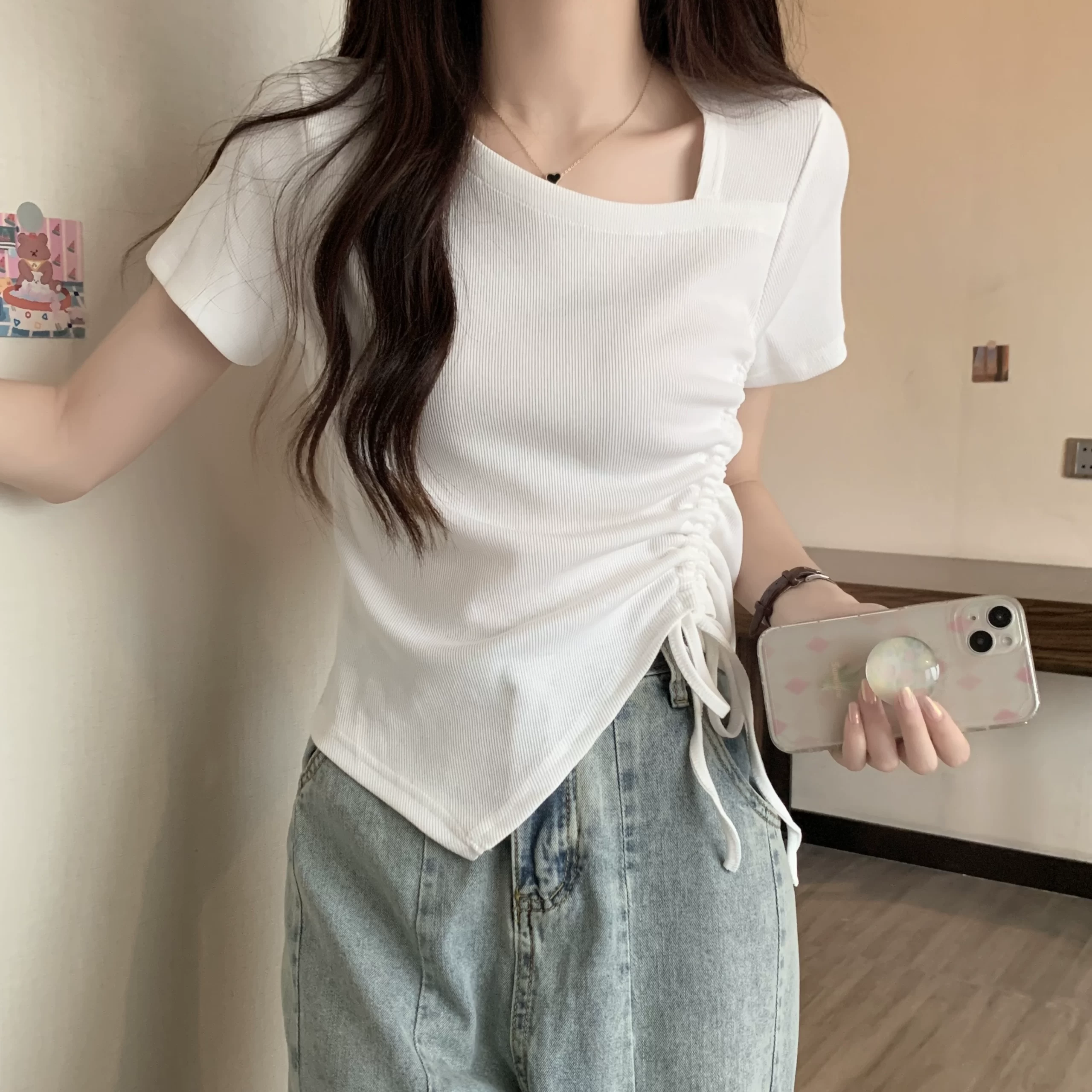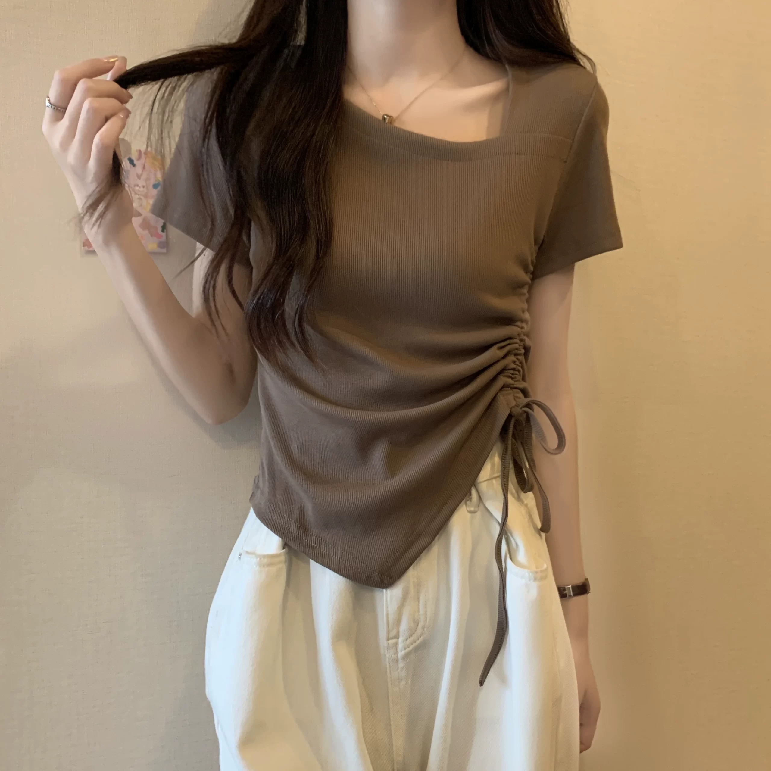 | nameOriginal | Designed right-shoulder short-sleeved summer slimming top with drawstring |