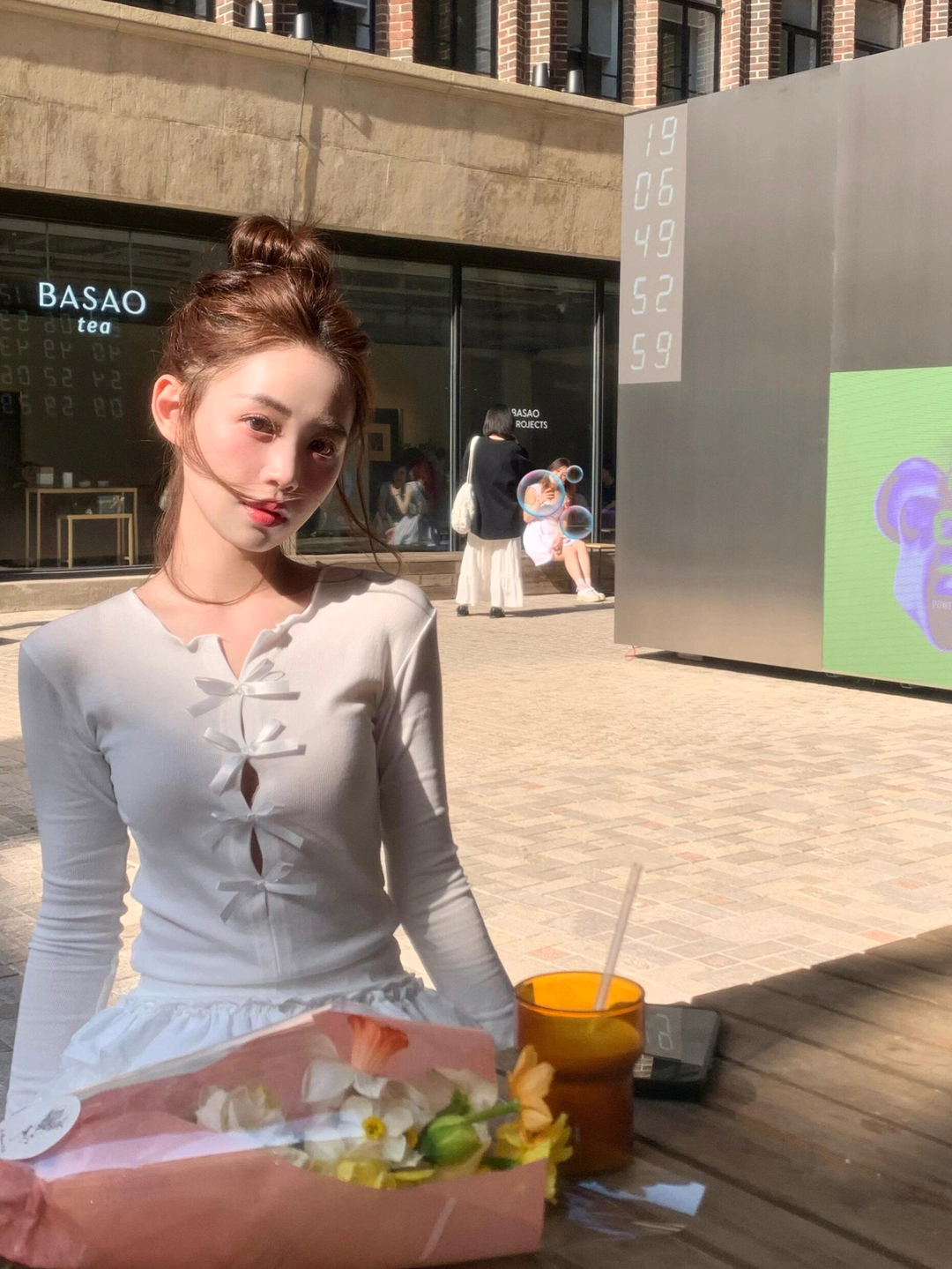 Designed spring hollow retro bow T-shirt