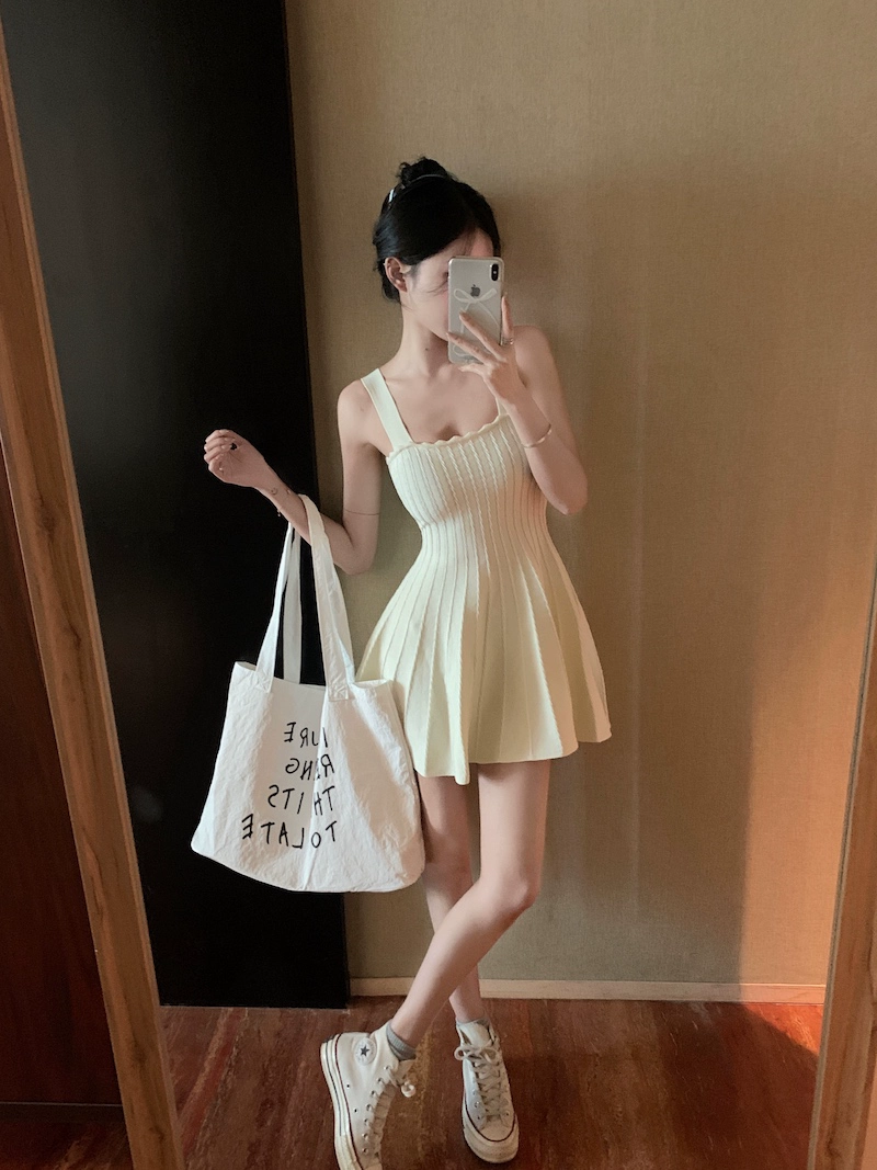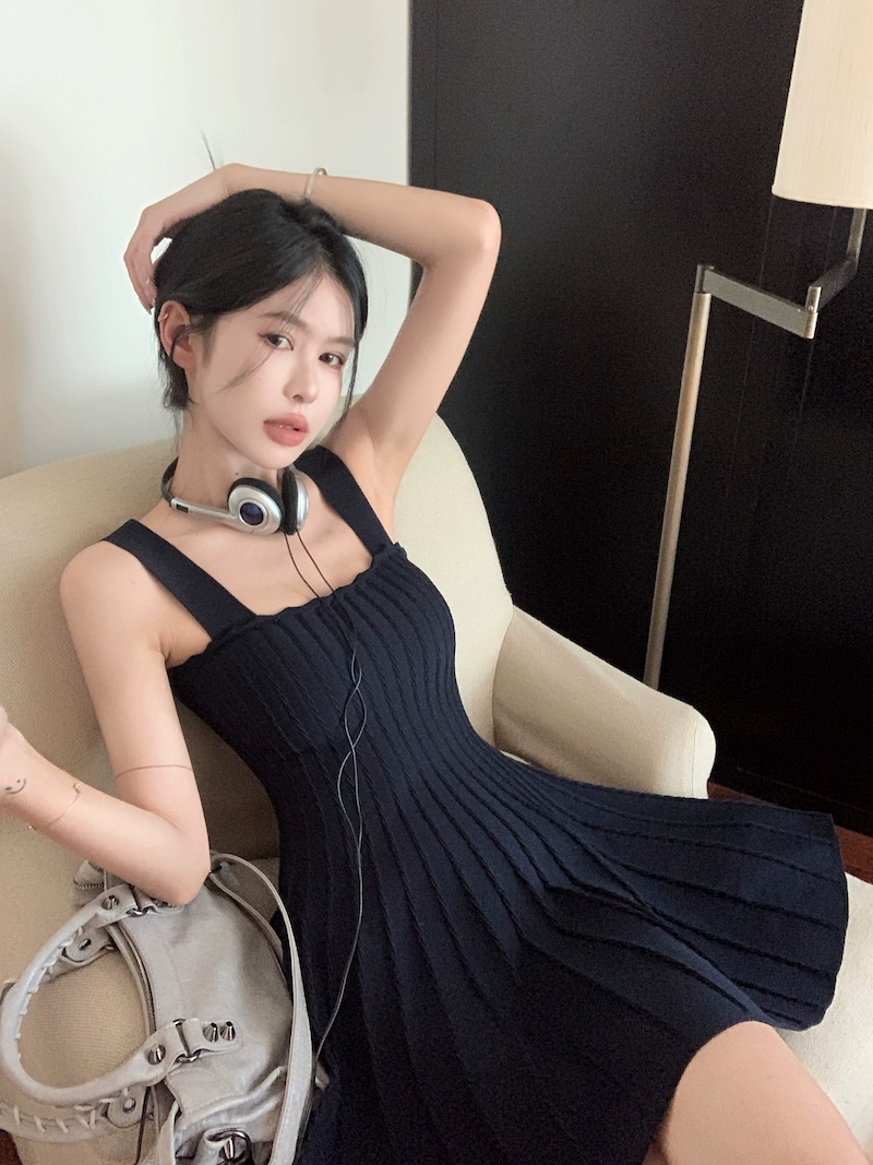 Designer summer pleated A-line suspender dress