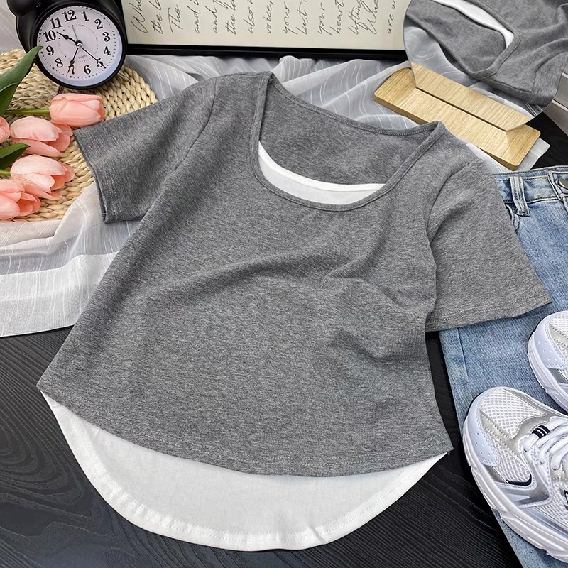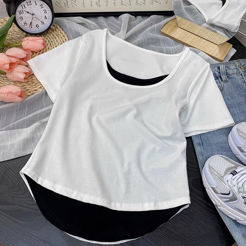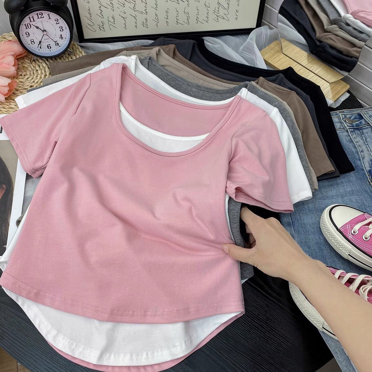| nameOriginal | Designing U-neck Stacked Colored Fake Two-piece Short-sleeved T-shirt Women's Summer Slim-fit Slimming Western-style Short Top |