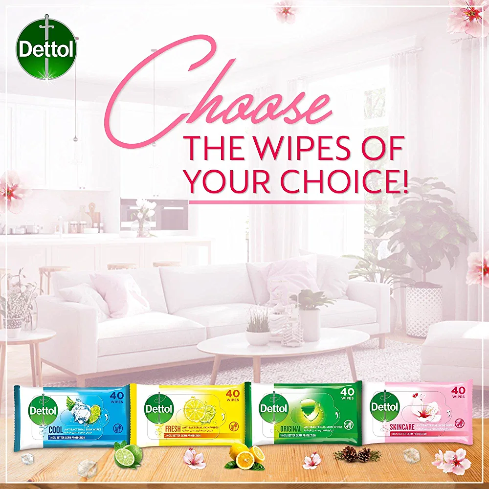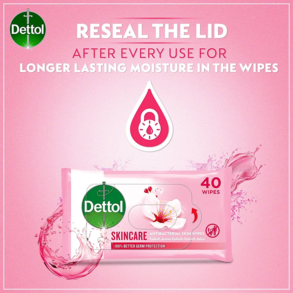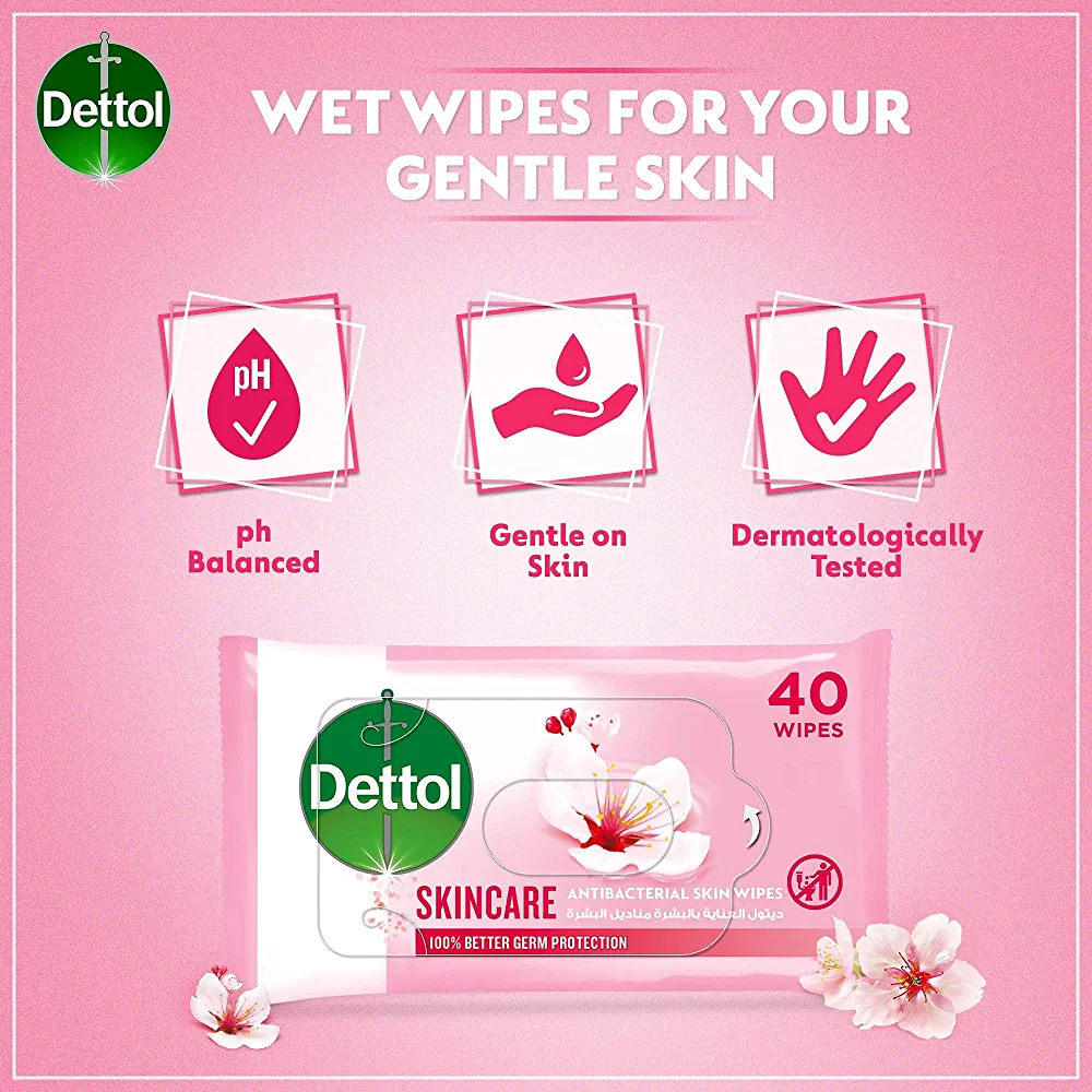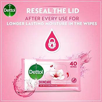 | nameOriginal | Dettol Skincare Antibacterial Skin Wipes for Use on Hands, Face, Neck etc, Protects Against 100 Illness Causing Germs, Pack of 40 Water Wipes |