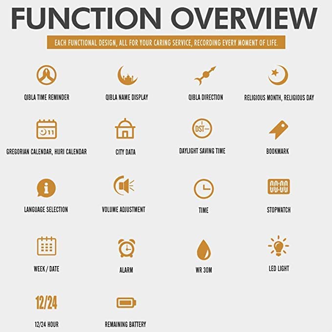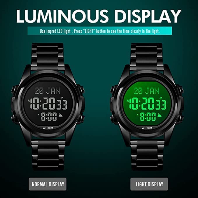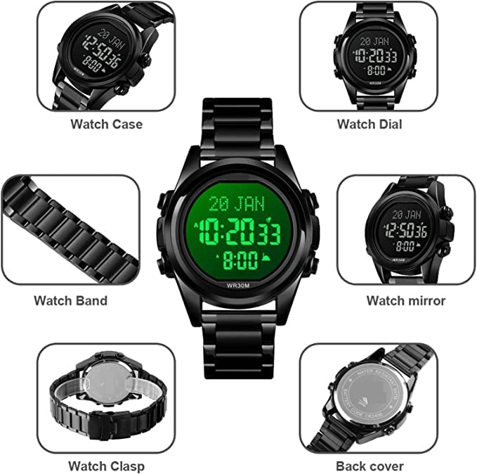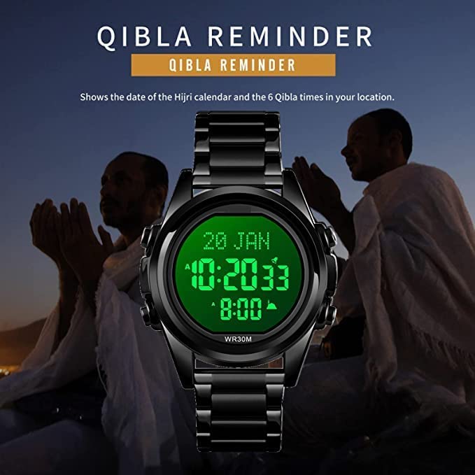 Introducing the Stainless Steel Muslim Islamic Qibla Digital Watch Prayer Compass, the perfect accessory for any devout Muslim. This watch is designed to help you keep track of prayer times and find the direction of the Qibla with ease. The sleek black and white design is both stylish and functional, making it a great gift for any man in your life. The watch is made of high-quality stainless steel, ensuring durability and longevity. The digital display is easy to read and features a built-in compass to help you find the Qibla no matter where you are. The watch comes with a gift box, making it an excellent gift for any occasion. Don’t let prayer times catch you off guard – get the Stainless Steel Muslim Islamic Qibla Digital Watch Prayer Compass today!