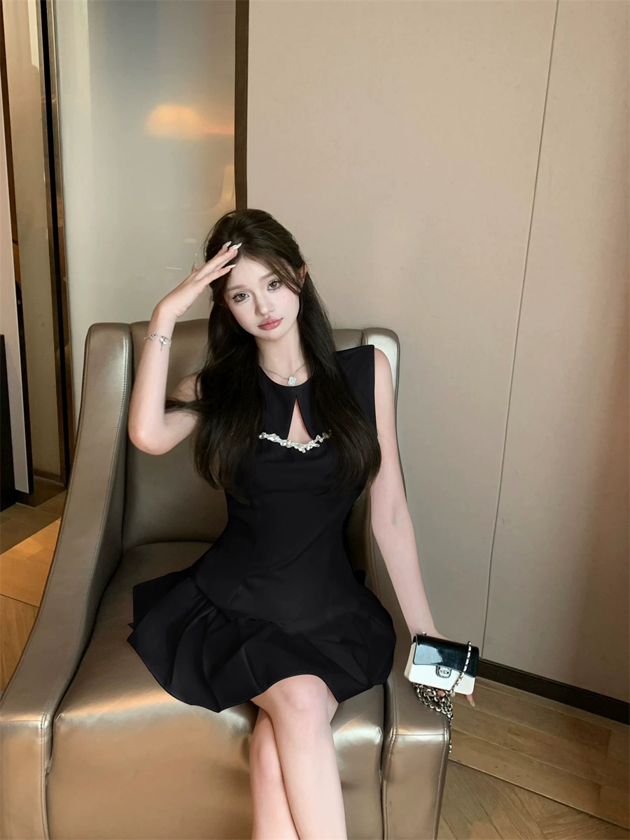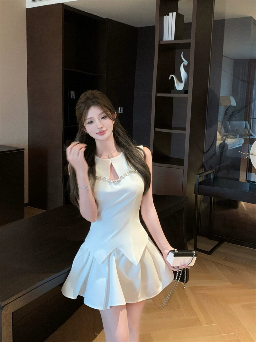 Diamond-embellished puffy skirt, A-line two-piece vest