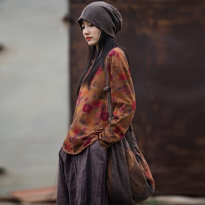 Digital Printing Sand Wash Dressed 24 Spring Cotton and Linen Women’s New Long-sleeved T-shirt Artistic All-match Travel Women’s Bottoming