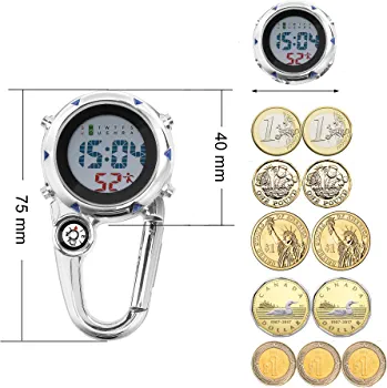Crafted with a stainless steel strap and clasp, this watch is designed to clip securely onto your bag or clothing. It features a precise Japanese imported quartz movement to keep time and a durable scratch-resistant mineral crystal to protect the dial. With a case diameter of 1.57 inches, a case thickness of 0.43 inches, and a watch length of 2.95 inches, this watch is the perfect size for any adventure. It weighs just 2 ounces, making it lightweight and easy to carry.
