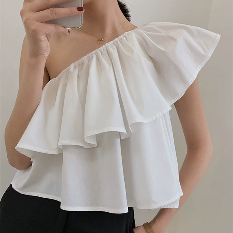 | nameOriginal | Discreetly designed clavicle-exposed one-shoulder sleeveless shirt |
