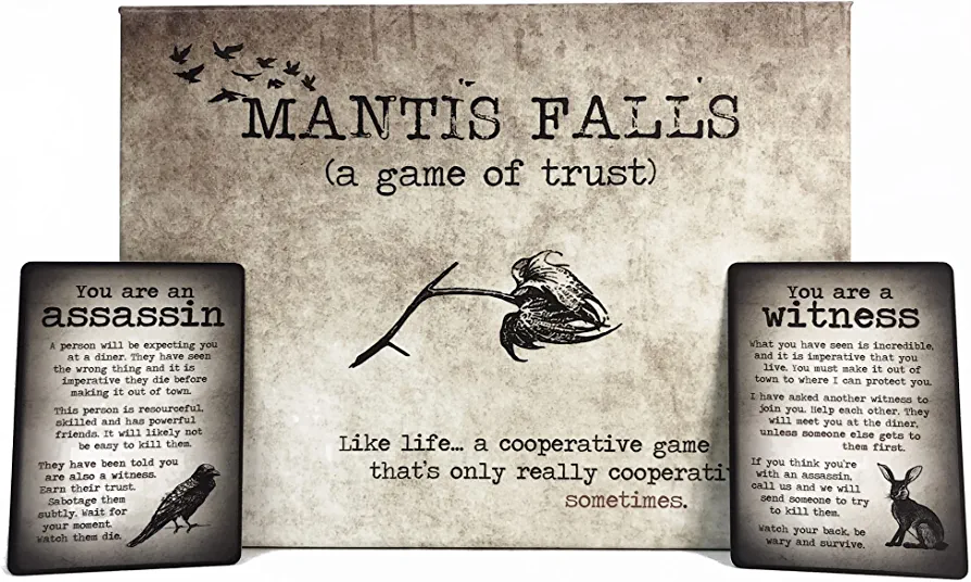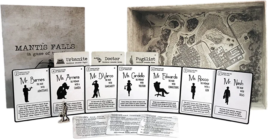 Mantis Falls is a thrilling strategy game designed for 2-3 players, where you must survive the night and escape the mob-ruled town of Mantis Falls in the 1940s. The game combines hand-building and tactical card play with deduction and cooperation, but beware, there may be a hidden assassin among you.