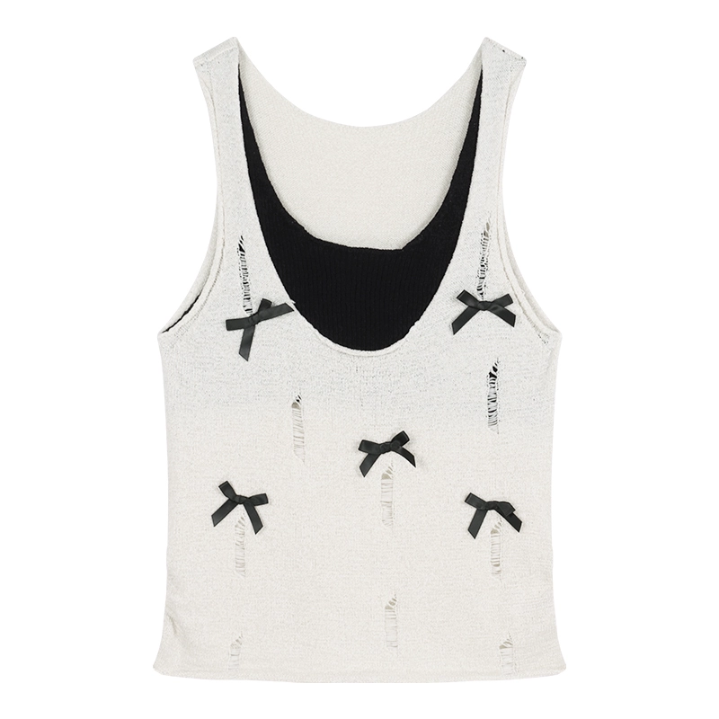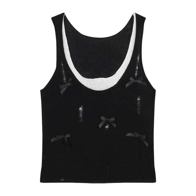 | nameOriginal | Distressed Contrast Color Slim Bow Sleeveless Fake Two Piece |
