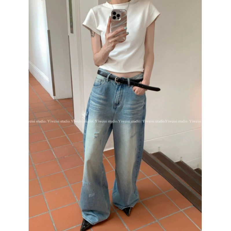 | nameOriginal | Distressed wide-leg high-rise straight-leg washed denim trousers |