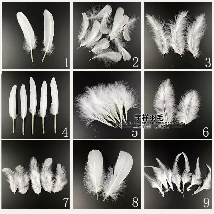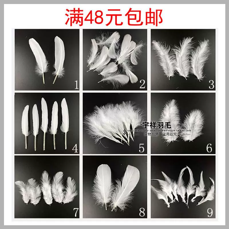 | nameOriginal | DIY jewelry accessories materials feathers 18 styles of bulk white wedding feathers, goose feathers, turkey feathers, 50 pieces/pack |
