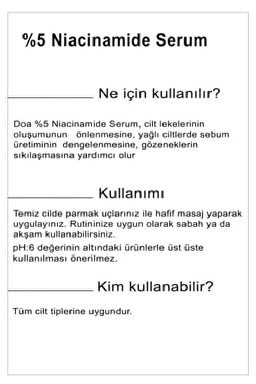 Note:The dates on the product are production dates, doa cosmetics send the products to you as fresh as per the concept of fresh cosmetics. Niacinamide 5% Serum Doa 5% niacinamide serum helps prevent the formation of skin spots, stabilize sebum production on oily skin, tighten pores. Usage/ Usage: Apply to clean skin with your fingertips by lightly massaging. You can use your skin at any time you need it. Suitable for all skin types. Warnings/ Warnings: *For external use. Avoid eye contact. Store in cool and dry places below room temperature, out of reach of children with the lid closed. *Production date (URT) and Part No (PN) are on the packaging. Ingredients/Ingredients: Aqua, Sodium Lactate, Niacinamide, Theralose, Dimethyl Sulfone, Pentylene Glycol, Isopentyldiol, Saccharide Isomerate, Zinc PCA, Sodium Hyaluronate, Centella Asiatica Extract, Phenoxyethanol, Caprylyl Glycol